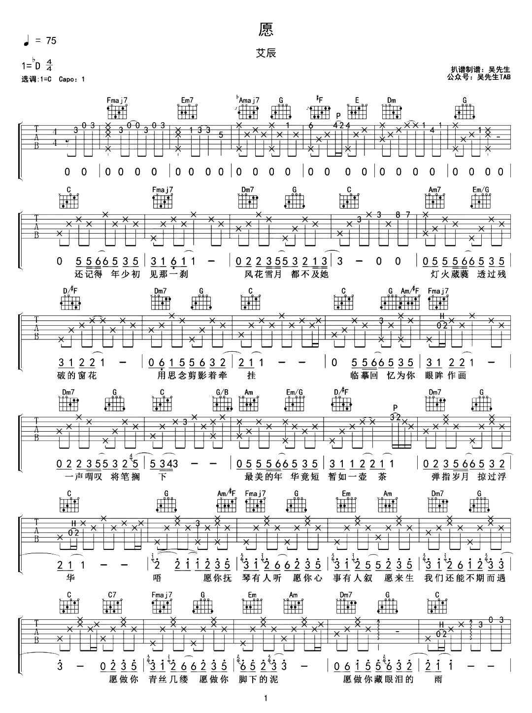《艾辰《愿吉他谱》(C调)》内容来自于互联网,不能保证内容的准确性与完整性,仅供学习交流欣赏,请勿用于其它用途,内容版权归原作者及来源网站所有,如有侵犯到您的权益请来信告知,我们将及时删除。