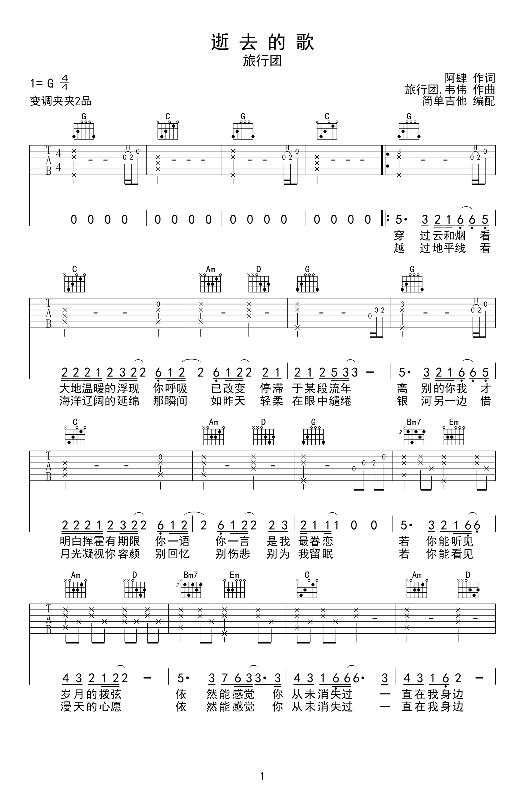 "逝去的歌" 吉他谱是一首关于离别的歌曲,由旅行团乐队演唱。这首歌曲的旋律温馨细腻,唤起了对逝去的人与事的怀念。在匆忙的生活中,我们无法重拾过去,只能将它们留存在记忆中。这份吉他谱采用G调指法,原调是A调,建议使用CAPO夹2品以回到原调,难度适中,适合初学者