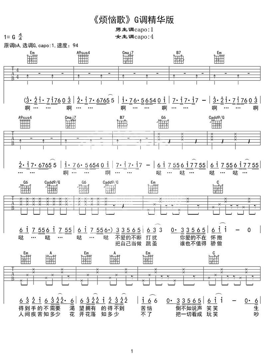 《张学友《烦恼歌吉他谱》(G调)》内容来自于互联网,不能保证内容的准确性与完整性,仅供学习交流欣赏,请勿用于其它用途,内容版权归原作者及来源网站所有,如有侵犯到您的权益请来信告知,我们将及时删除。