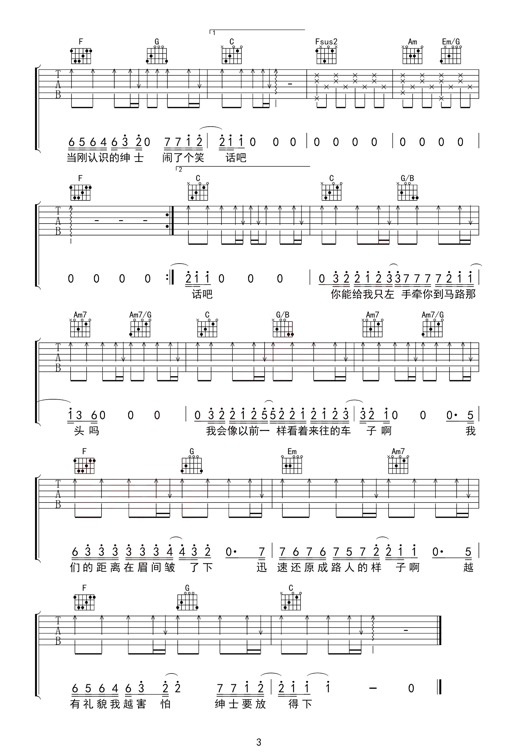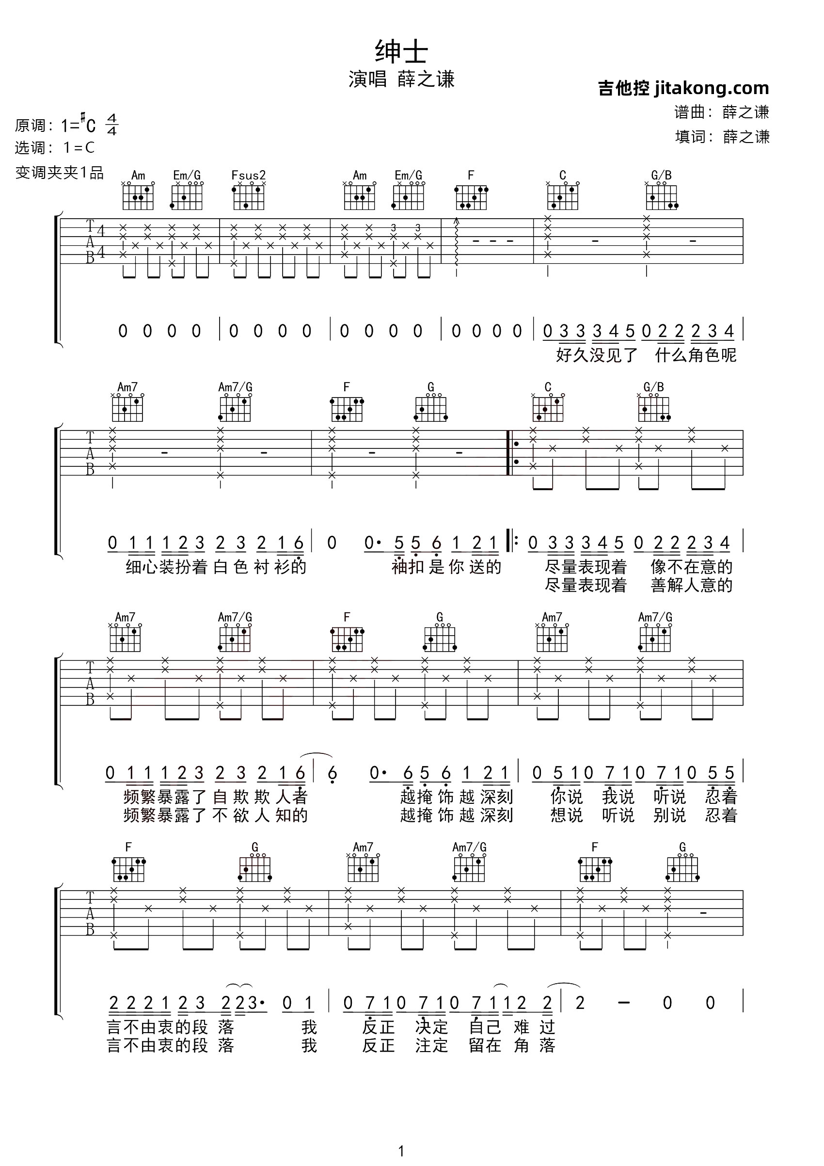 《薛之谦《绅士吉他谱》(C调)》内容来自于互联网,不能保证内容的准确性与完整性,仅供学习交流欣赏,请勿用于其它用途,内容版权归原作者及来源网站所有,如有侵犯到您的权益请来信告知,我们将及时删除。