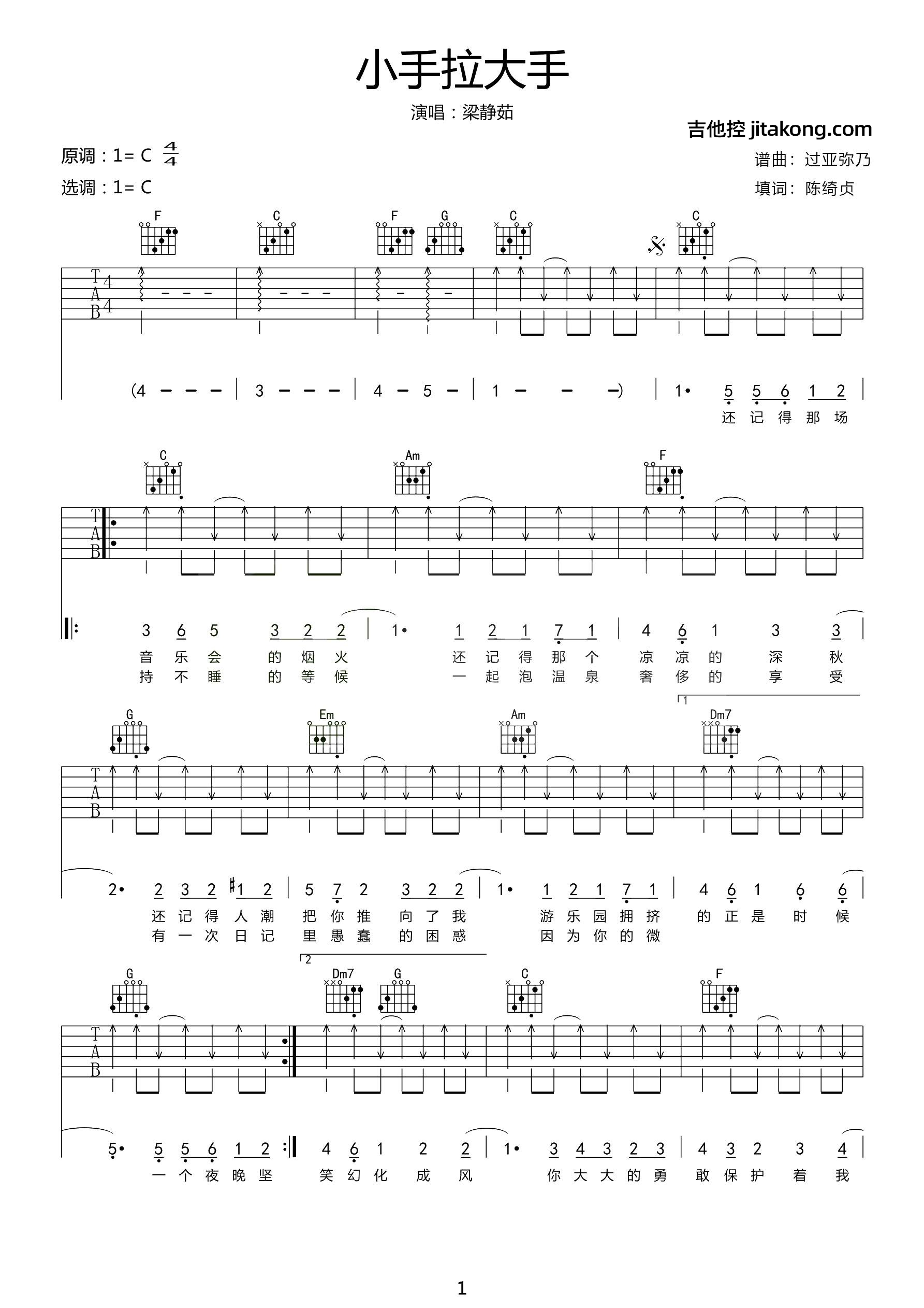 《梁静茹《小手拉大手吉他谱》(C调)》内容来自于互联网,不能保证内容的准确性与完整性,仅供学习交流欣赏,请勿用于其它用途,内容版权归原作者及来源网站所有,如有侵犯到您的权益请来信告知,我们将及时删除。