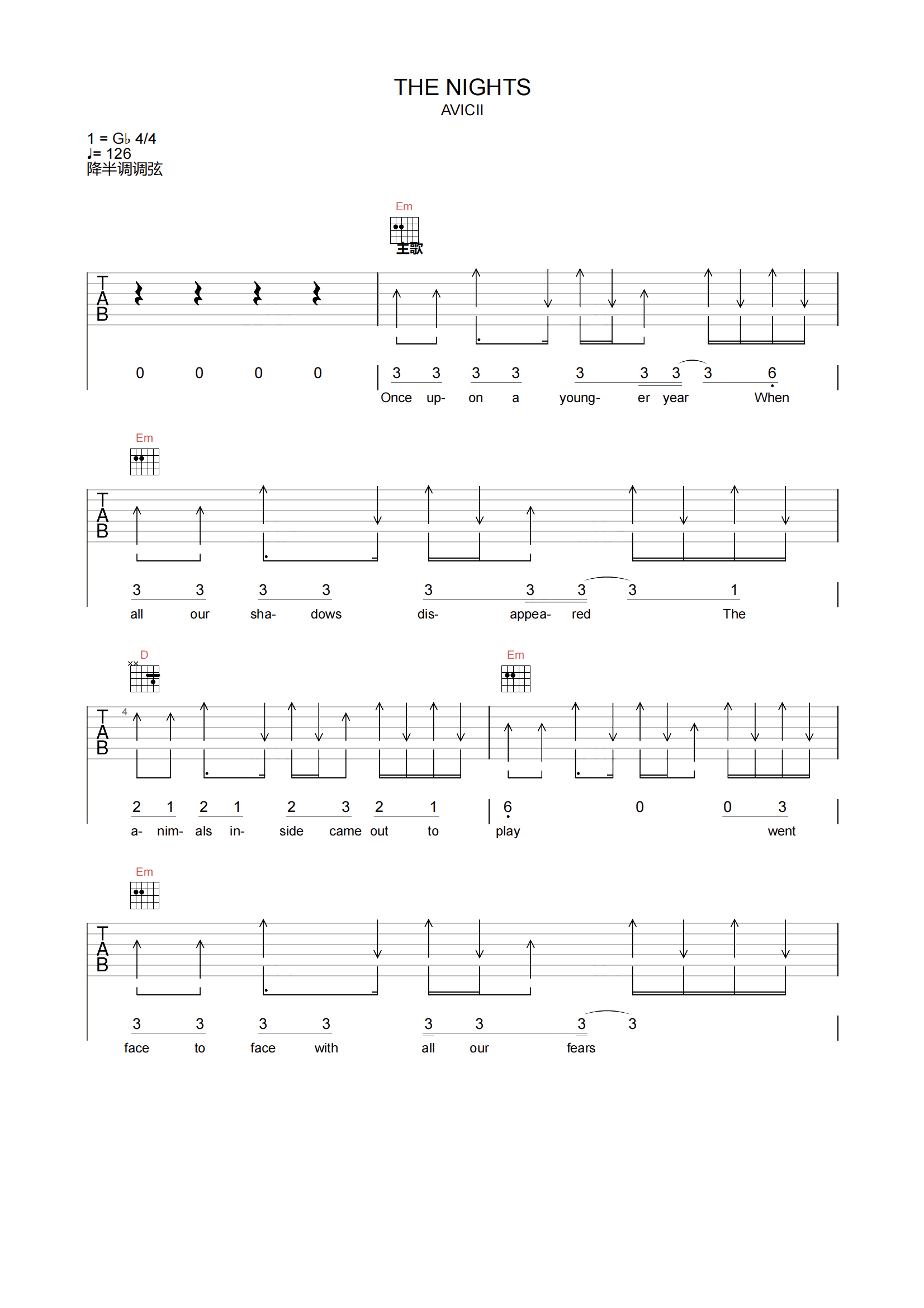 电音大师AVICII《THE NIGHTS吉他谱》(G调)
