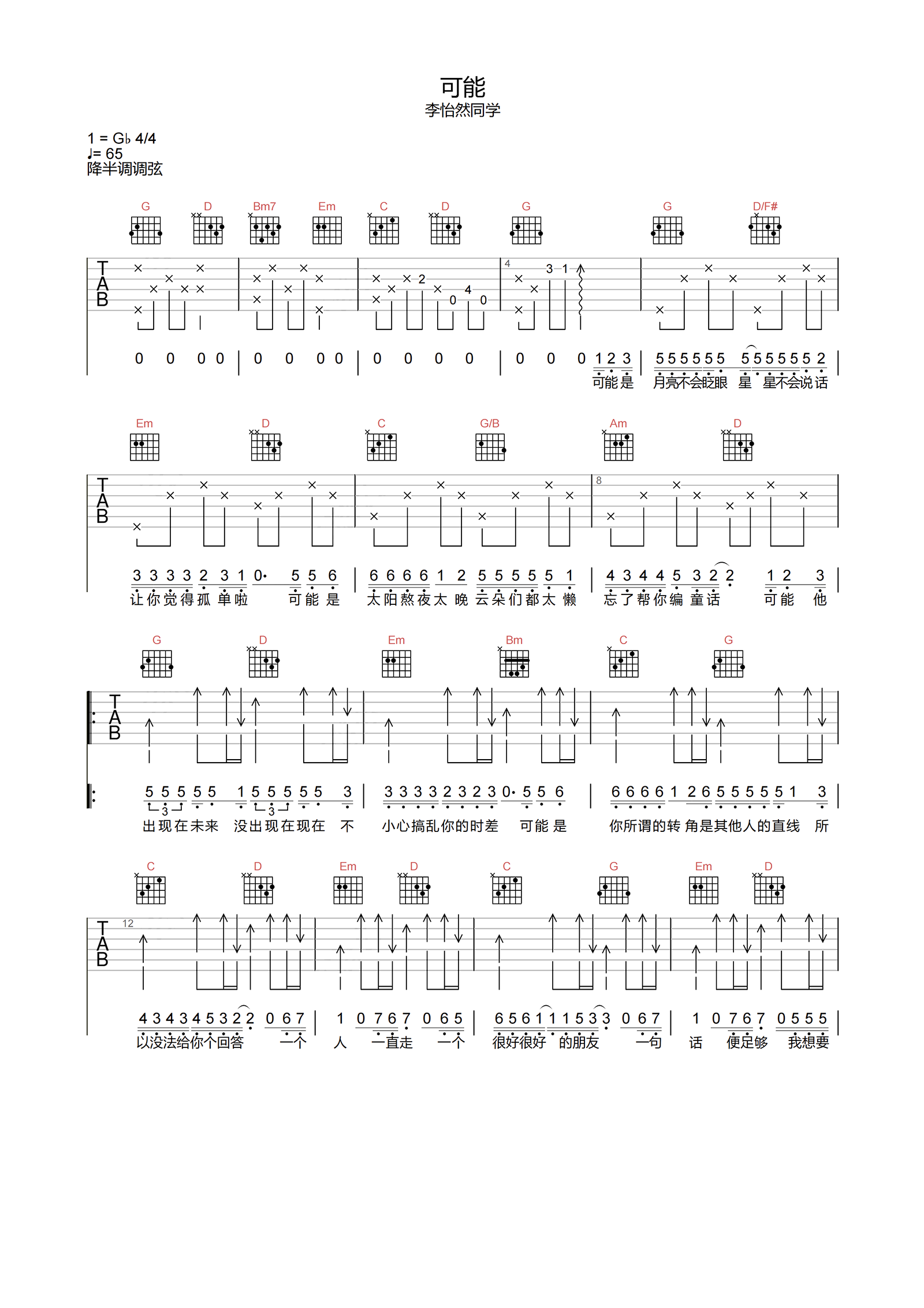 《李怡然同学《可能吉他谱》(A调)》内容来自于互联网,不能保证内容的准确性与完整性,仅供学习交流欣赏,请勿用于其它用途,内容版权归原作者及来源网站所有,如有侵犯到您的权益请来信告知,我们将及时删除。