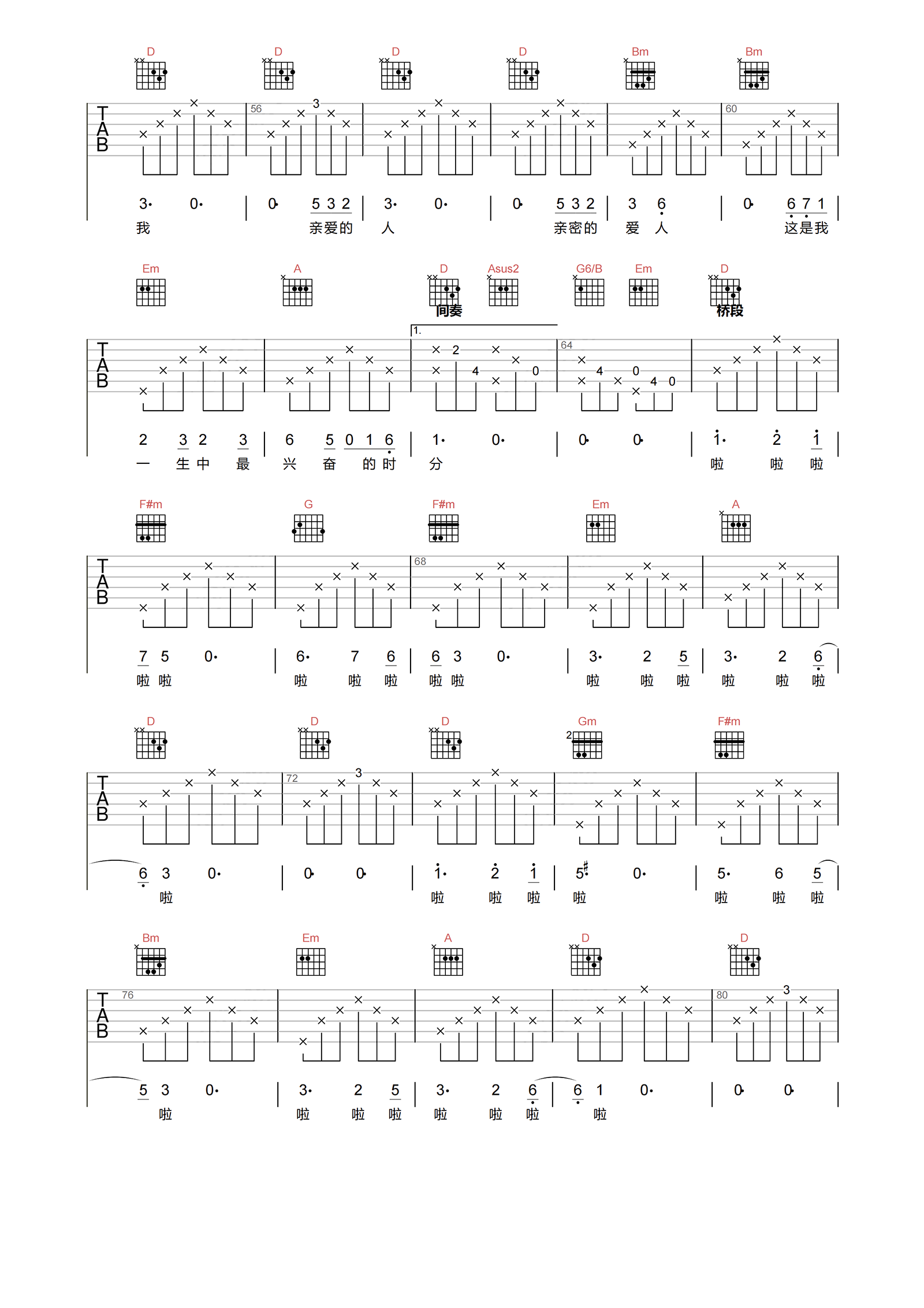 《王若琳《亲密爱人吉他谱》(E调)》内容来自于互联网,不能保证内容的准确性与完整性,仅供学习交流欣赏,请勿用于其它用途,内容版权归原作者及来源网站所有,如有侵犯到您的权益请来信告知,我们将及时删除。
