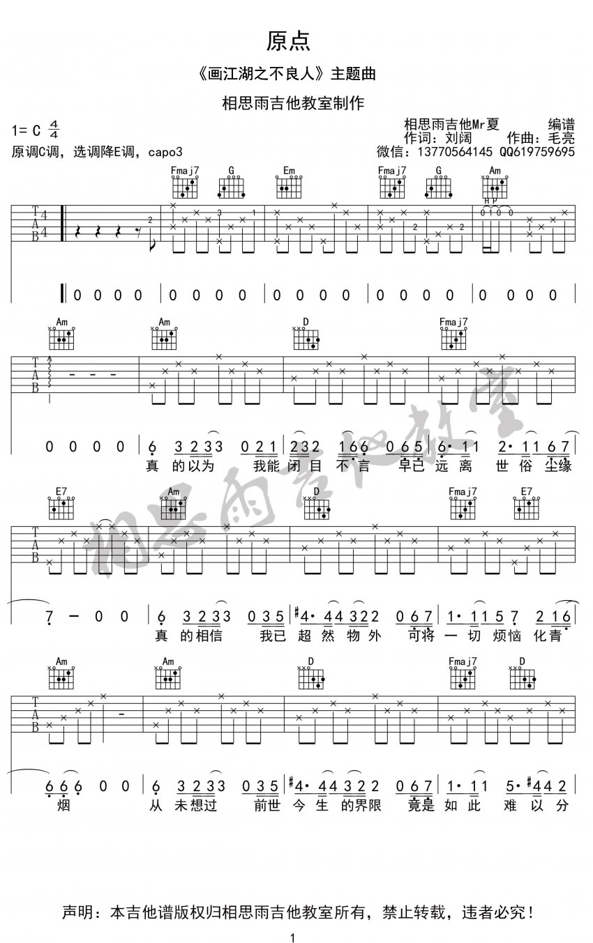 《原点》吉他谱,由西单女孩任月丽演唱,是动画片《画江湖之不良人》的主题曲。这首歌以C调编曲,使用变调夹夹三品,选调降E调。曲谱包括原点吉他弹唱谱和六线谱完整版,共五张图片谱例。歌曲旋律优美,描绘了一段深情厚意的爱恋。它唤起人们对于那些在默默无闻中默默守护的爱的