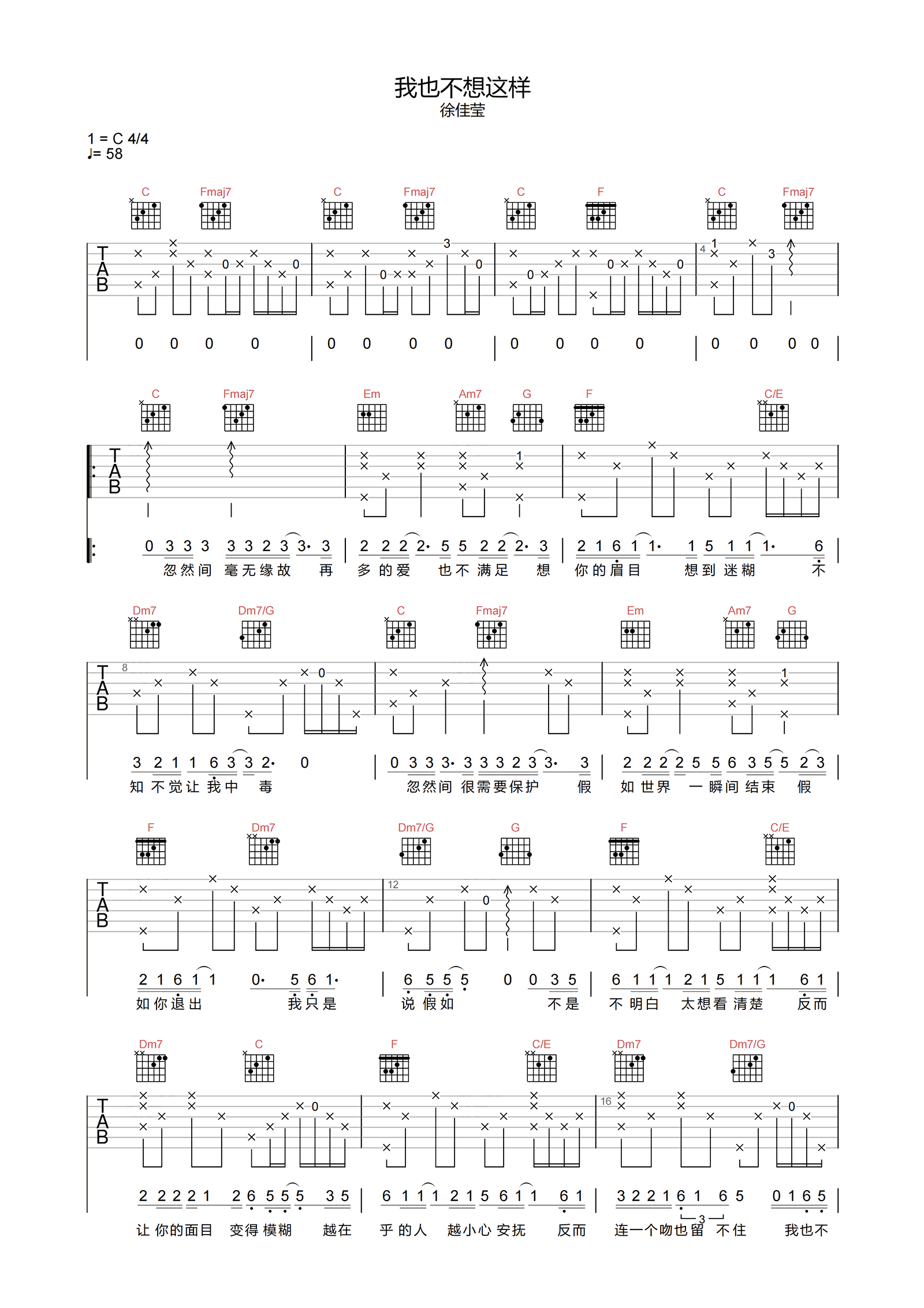 徐佳莹翻唱王菲的《我也不想这样》,在吉他谱中呈现。这首女生版调式曲子以C调指法编排,不需变调夹。以4/4拍的节奏和58BPM的速度演奏,难度相对简单。吉他手可以在本页下方找到曲谱的PDF版本下载。这首歌曲的吉他谱将带领你感受深情的旋律,让你深陷其中,情不自禁。