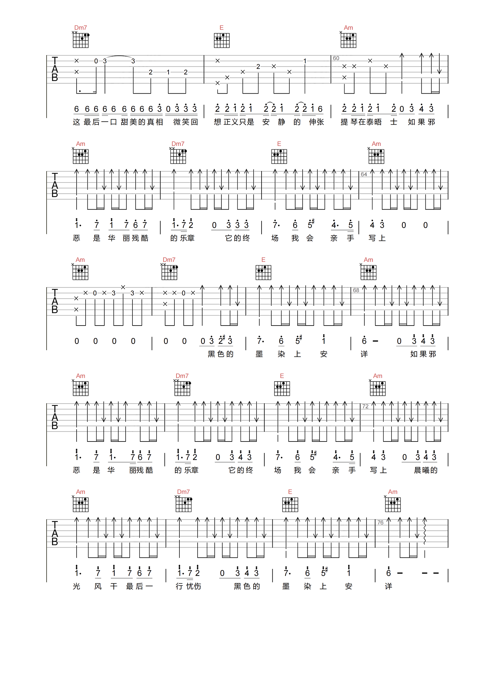 《夜的第七章》吉他谱,由周杰伦演唱,融合了悬疑情节,寓意着1983年名侦探福尔摩斯的故事。这首歌让人仿佛置身于电影中,充满神秘美感。开头是急促的打字机声,接着周杰伦以福尔摩斯的角色,以自白式的Rap将听众带入凶杀案的解谜之旅。吉他谱选用C调指法,演奏速度为每分