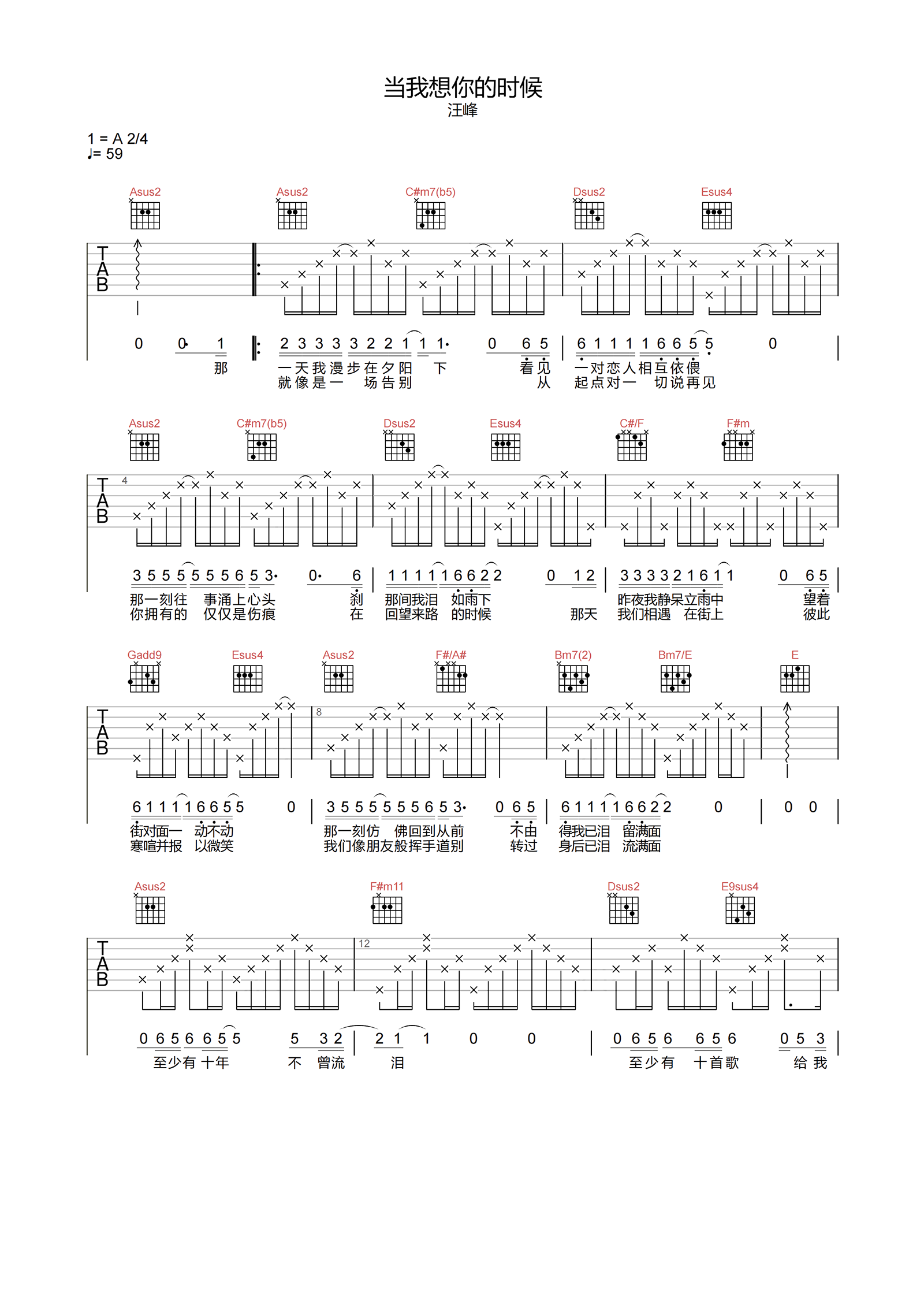 《汪峰《当我想你的时候吉他谱》(A调)》内容来自于互联网,不能保证内容的准确性与完整性,仅供学习交流欣赏,请勿用于其它用途,内容版权归原作者及来源网站所有,如有侵犯到您的权益请来信告知,我们将及时删除。