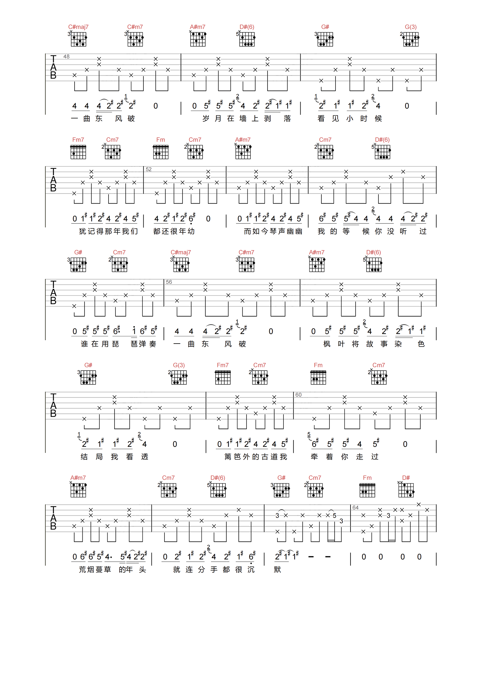 《东风破》是一首融合古琵琶曲与二胡琵琶小调的音乐佳作。通过韵律的巧妙编排,仿佛将人带入了唐诗宋词的雅致场景。方文山的文字点缀使古朴与现代完美融合,赋予这首歌曲新的内涵。吉他谱采用G调指法,原调编配,无需变调夹,4/4拍的74BPM节奏,前奏与原版相符,难度适中
