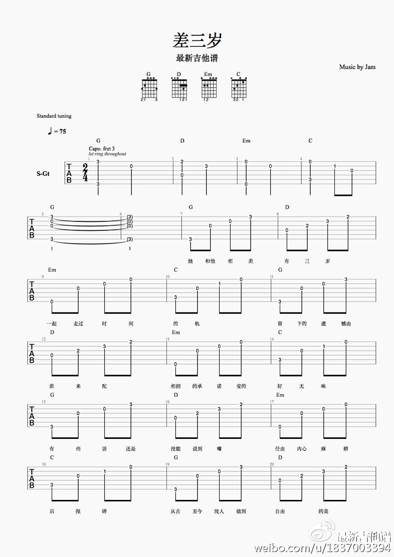 这是一首感人至深的民谣歌曲《差三岁》,由歌手Jam阿敬演唱。歌曲采用G调,Capo3品TAB图片谱,共五张图片谱例,跨越两页呈现。Jam以宛如故事般的嗓音,细腻地诠释了这个充满温情的故事。民谣深深触动人心,在歌声中传达着深沉的情感。在这首歌中,女歌手用她青涩的