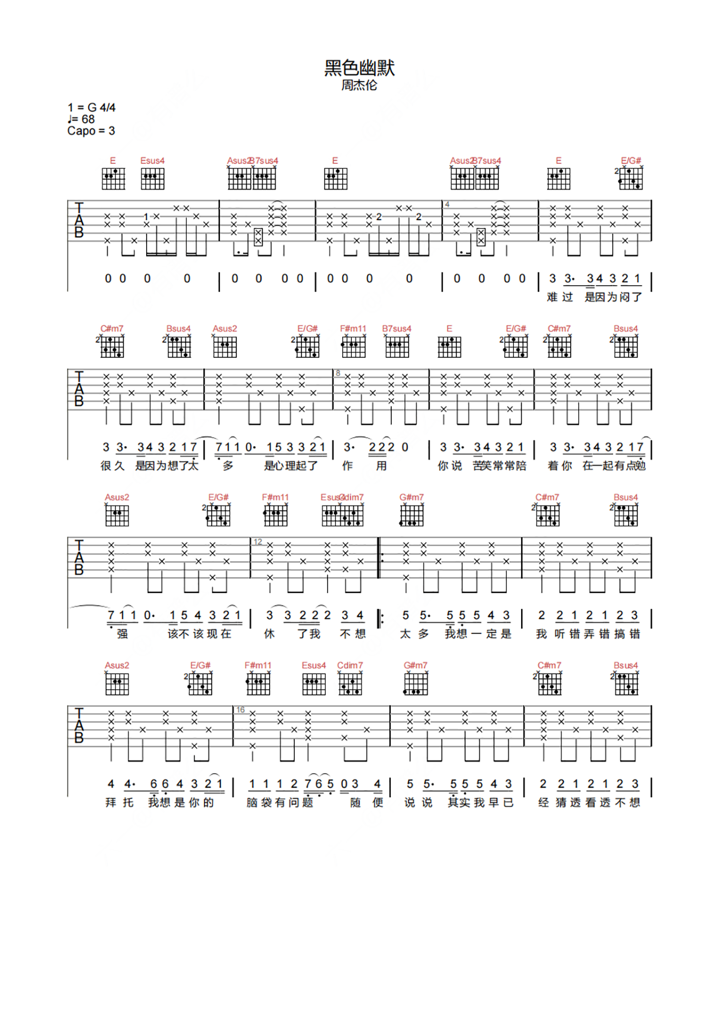 《周杰伦《黑色幽默吉他谱》(G调)》内容来自于互联网,不能保证内容的准确性与完整性,仅供学习交流欣赏,请勿用于其它用途,内容版权归原作者及来源网站所有,如有侵犯到您的权益请来信告知,我们将及时删除。