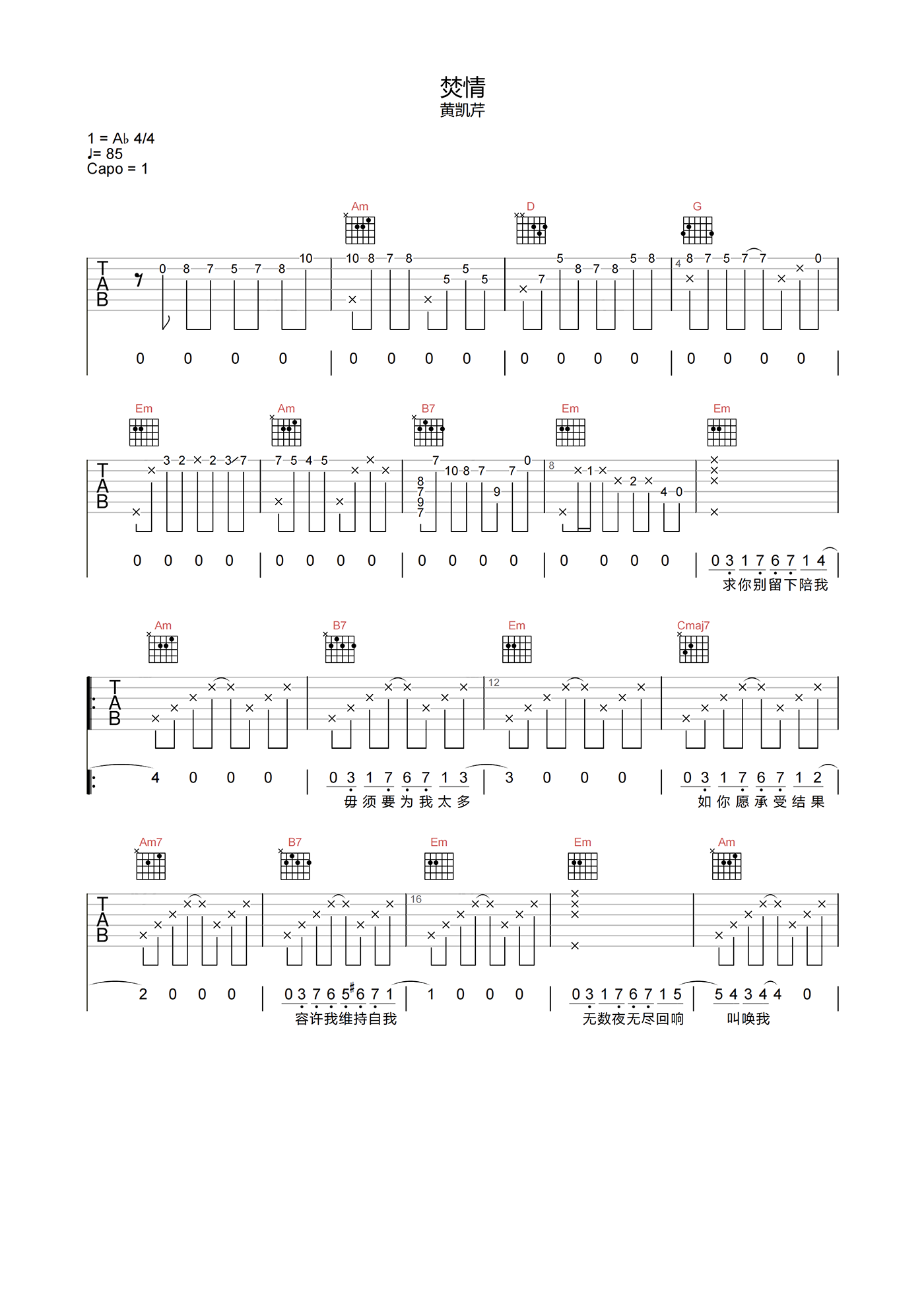 《黄凯芹《焚情吉他谱》(G调)》内容来自于互联网,不能保证内容的准确性与完整性,仅供学习交流欣赏,请勿用于其它用途,内容版权归原作者及来源网站所有,如有侵犯到您的权益请来信告知,我们将及时删除。