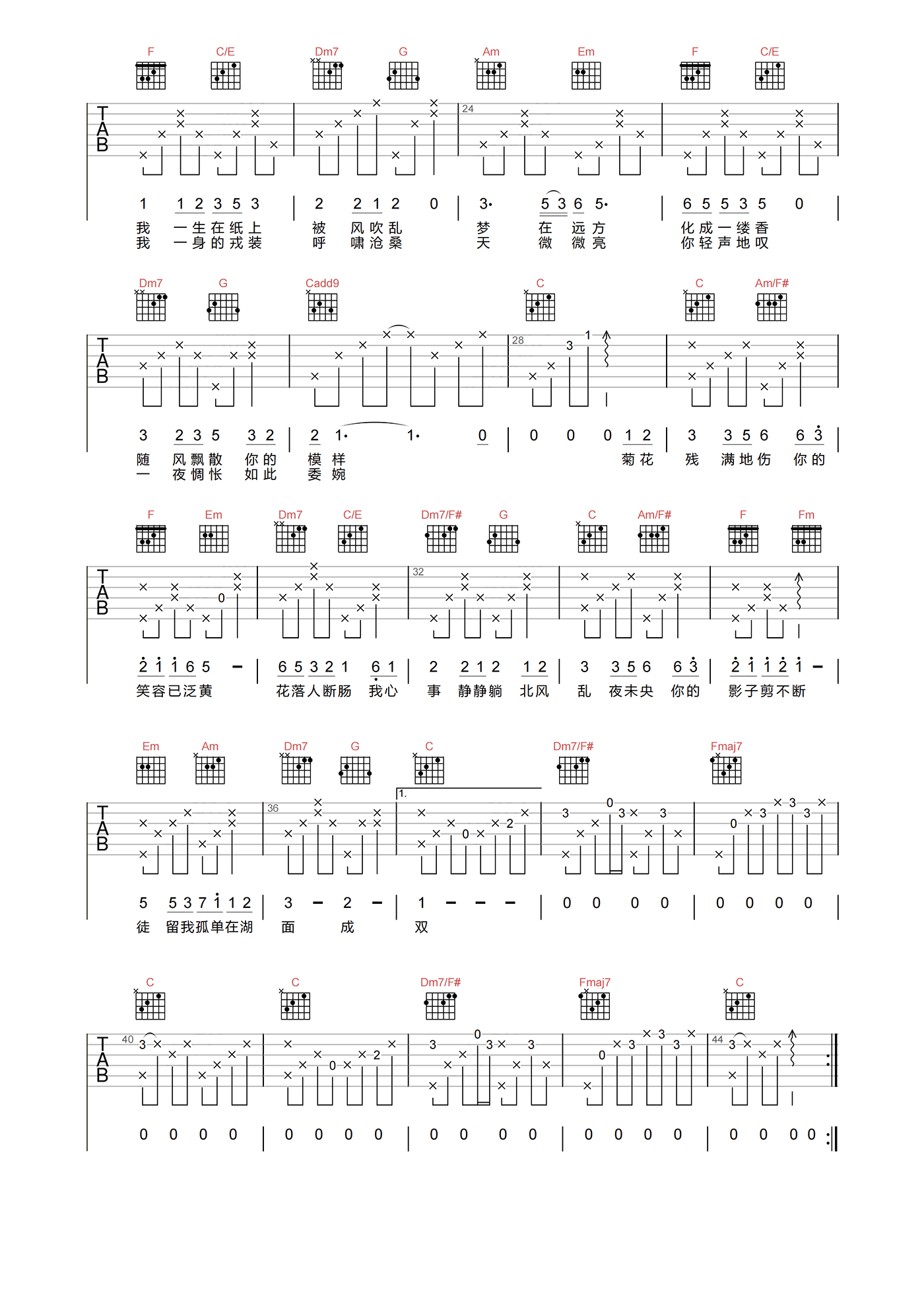 《周杰伦《菊花台吉他谱》(C调)》内容来自于互联网,不能保证内容的准确性与完整性,仅供学习交流欣赏,请勿用于其它用途,内容版权归原作者及来源网站所有,如有侵犯到您的权益请来信告知,我们将及时删除。