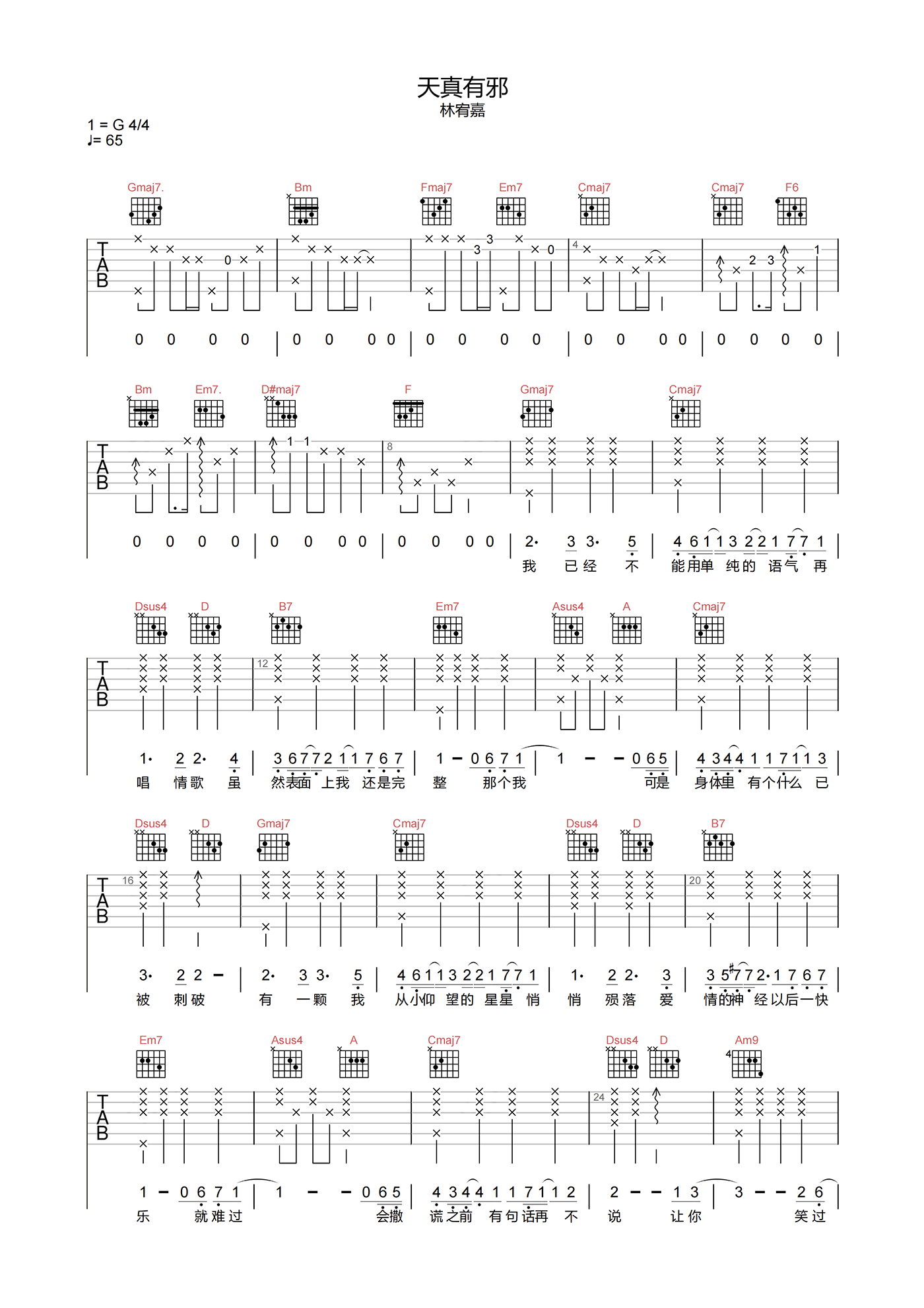 《林宥嘉《天真有邪吉他谱》(G调)》内容来自于互联网,不能保证内容的准确性与完整性,仅供学习交流欣赏,请勿用于其它用途,内容版权归原作者及来源网站所有,如有侵犯到您的权益请来信告知,我们将及时删除。