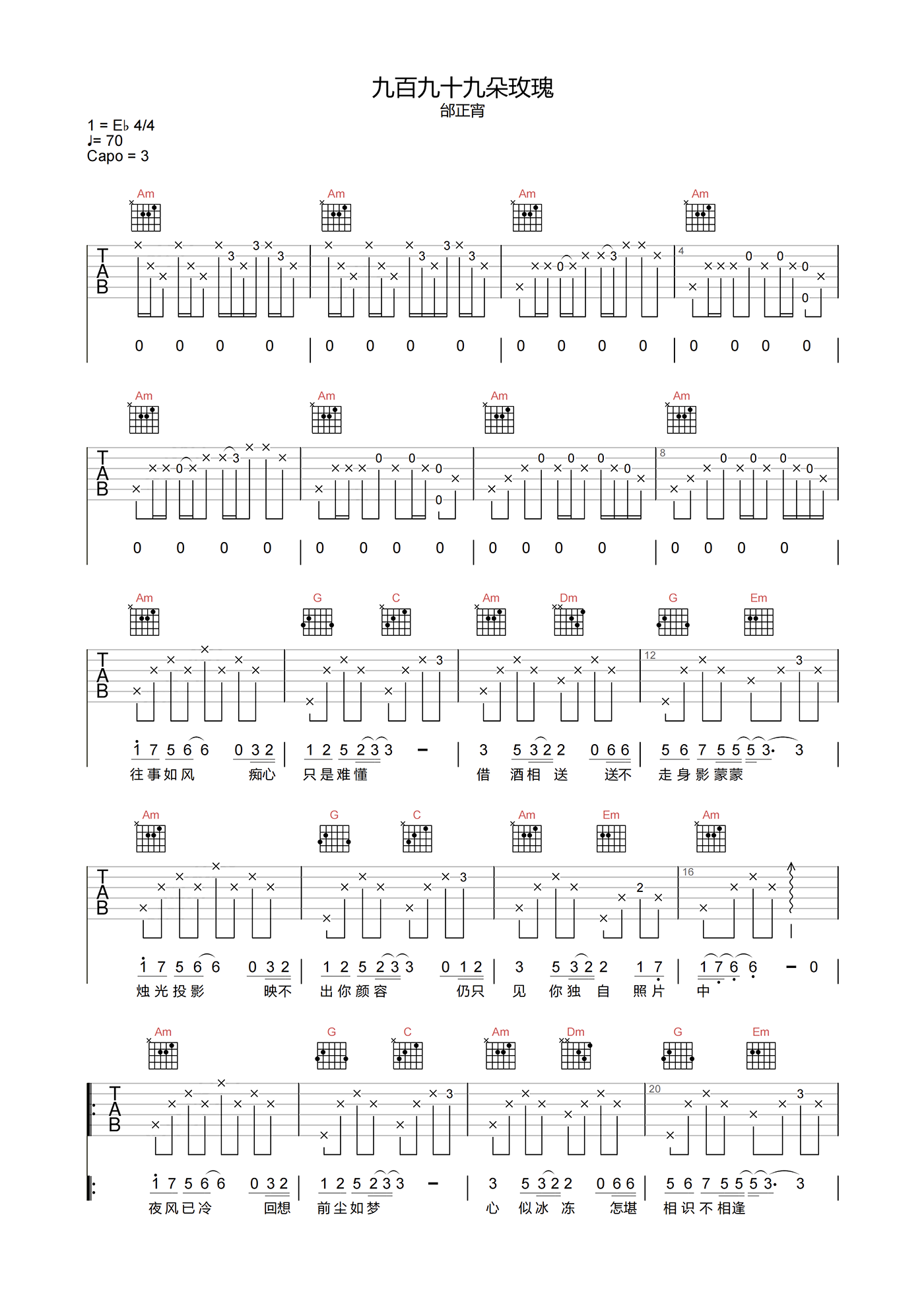 《九百九十九朵玫瑰》吉他谱,演唱者邰正宵,是一首充满情感的经典老歌。这首歌曲以C调指法演奏,原调bE,使用CAPO夹3品即可回到原调,演奏速度为每分钟70拍,拍号4/4。谱中包含独特的前奏,编配相较于原版稍有改动,难度评级为3级,属于较为简单的曲目。歌曲的背后