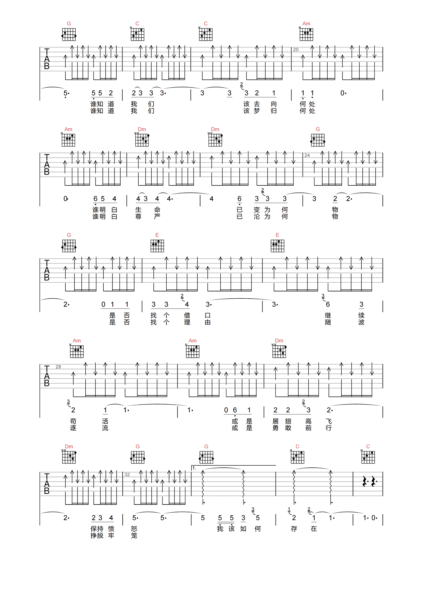 汪峰《存在吉他谱》(C调)