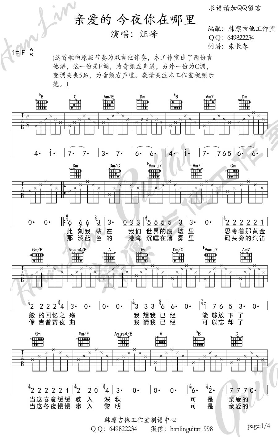 《汪峰《亲爱的今夜你在哪里吉他谱》(F调)》内容来自于互联网,不能保证内容的准确性与完整性,仅供学习交流欣赏,请勿用于其它用途,内容版权归原作者及来源网站所有,如有侵犯到您的权益请来信告知,我们将及时删除。