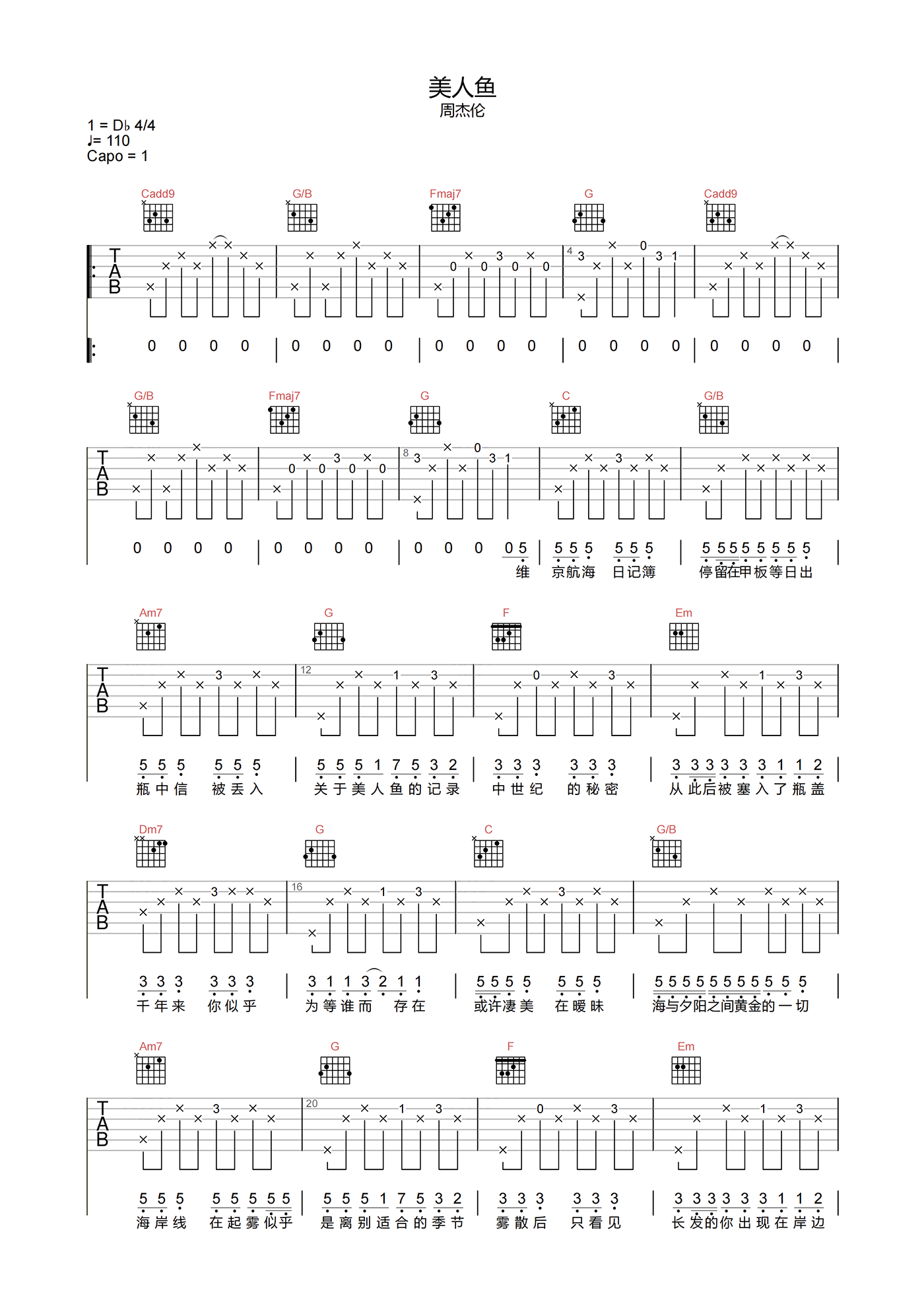 《周杰伦《美人鱼吉他谱》(C调)》内容来自于互联网,不能保证内容的准确性与完整性,仅供学习交流欣赏,请勿用于其它用途,内容版权归原作者及来源网站所有,如有侵犯到您的权益请来信告知,我们将及时删除。