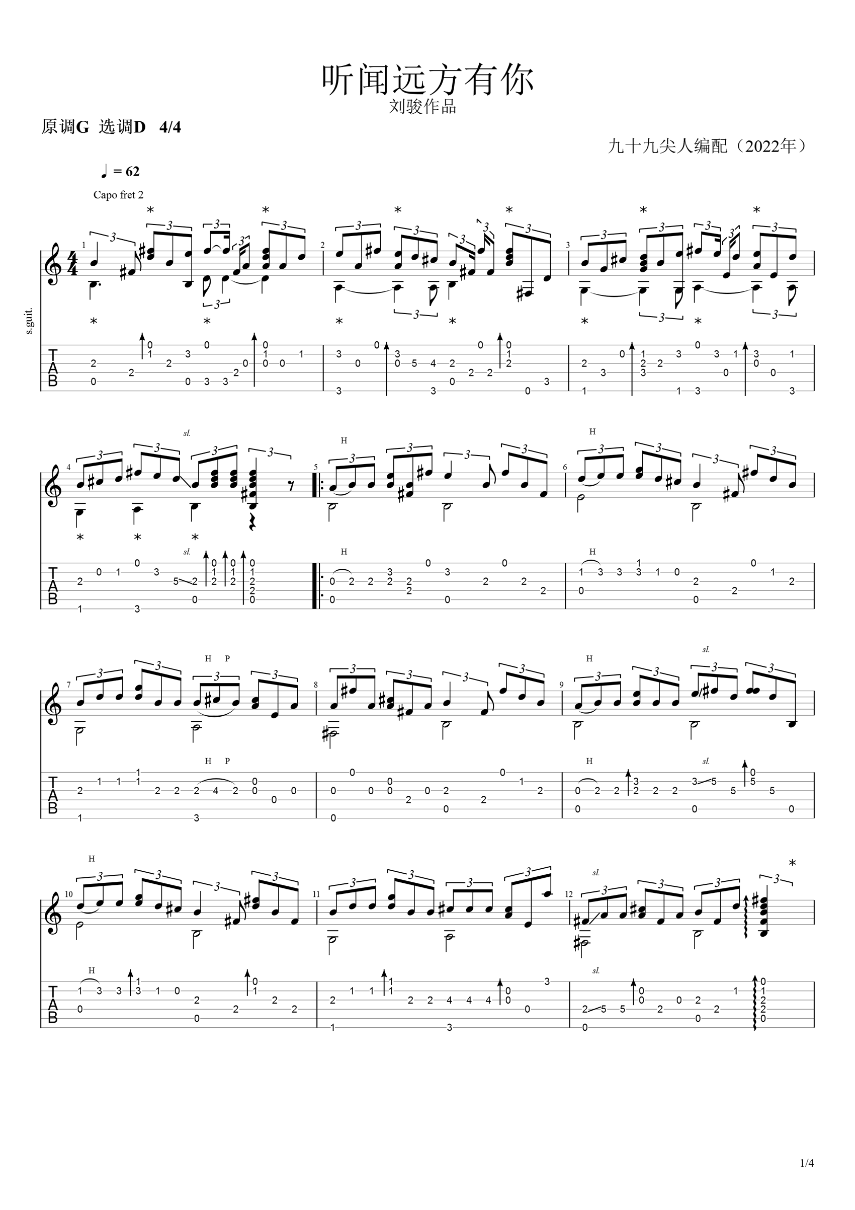 这首吉他曲《听闻远方有你》由刘艺雯演奏,采用标准调弦和4/4拍的节奏,无需特殊调音。建议使用变调夹在2品演奏,也可根据个人需要调整。曲谱由酷琴谱提供,共包含4张高清指弹吉他谱例,来源于@九十九尖人编配出品。歌曲情感真挚,歌词感人至深,旋律美妙动听,让人陶醉其中