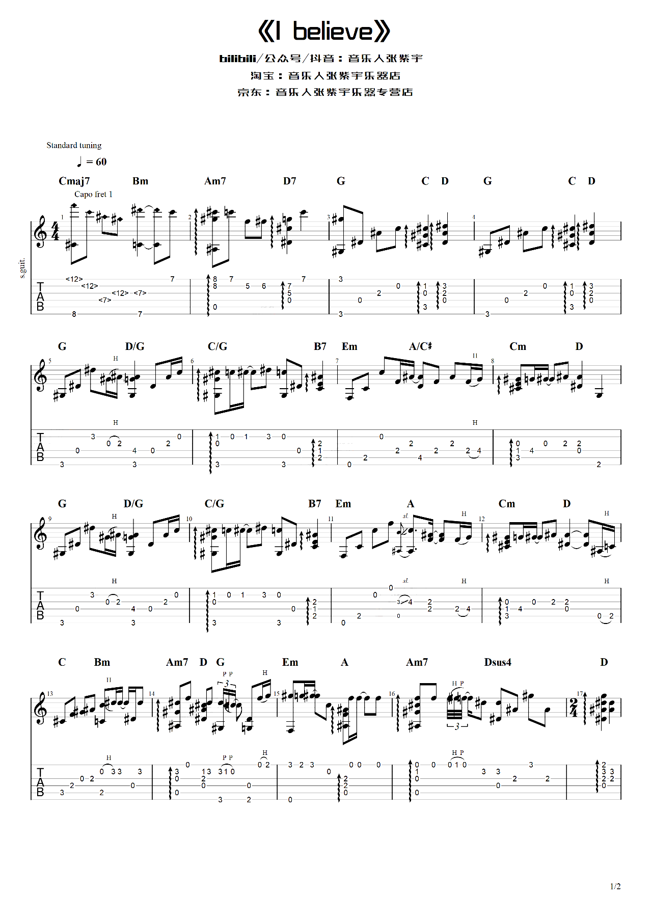 "I Believe"是张信哲演唱的一首指弹吉他曲目,常用标准调弦演奏,采用4/4拍的节奏,无需特殊调音。建议使用1品夹变调夹演奏,也可根据个人情况选择。这首歌曲作为韩国电影《我的野蛮女友》主题曲而广为人知。曲谱由酷琴谱提供,共2张高清图片指弹吉他谱例,来源于