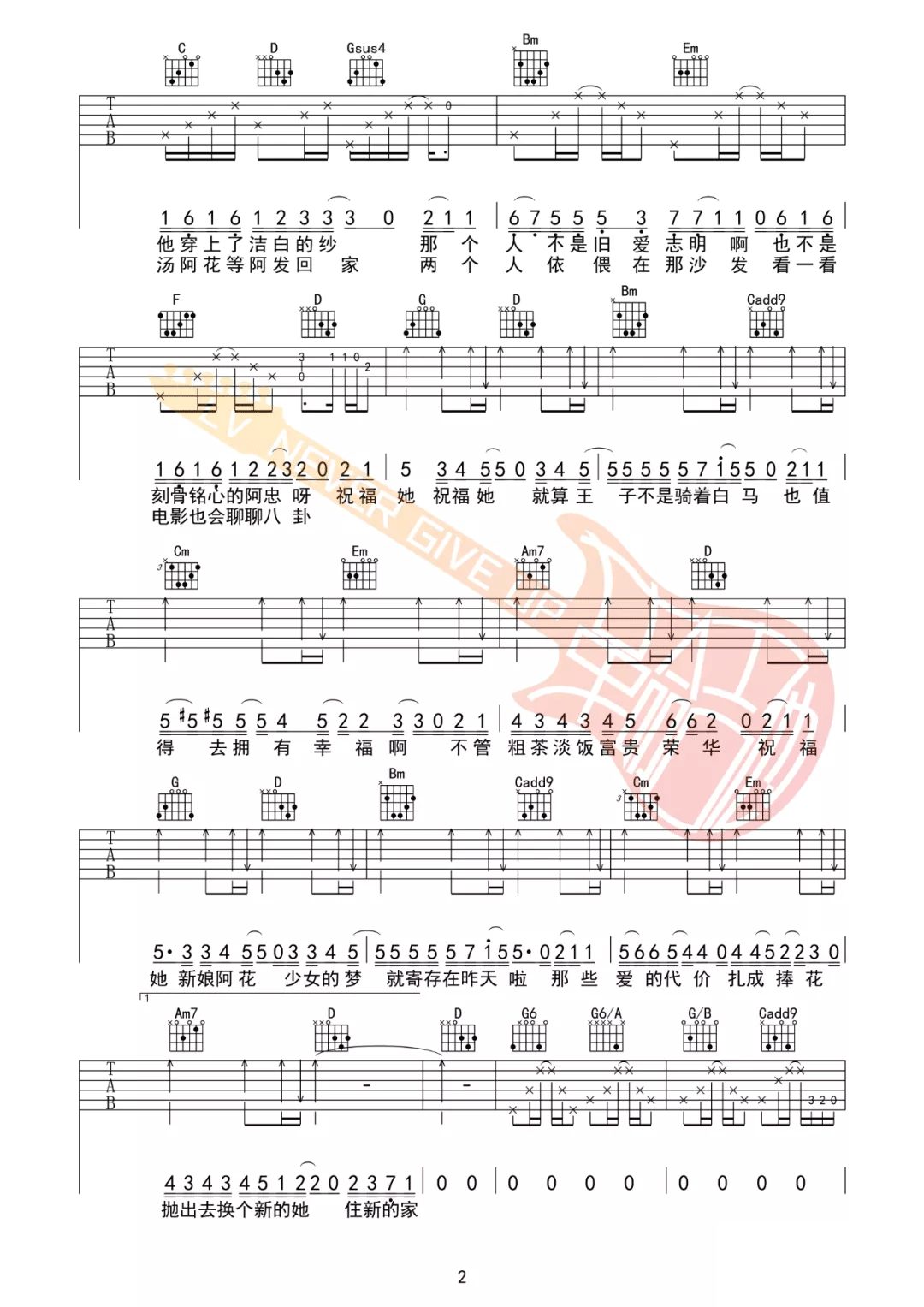 《金玟岐《新娘阿花吉他谱》(G调)》内容来自于互联网,不能保证内容的准确性与完整性,仅供学习交流欣赏,请勿用于其它用途,内容版权归原作者及来源网站所有,如有侵犯到您的权益请来信告知,我们将及时删除。
