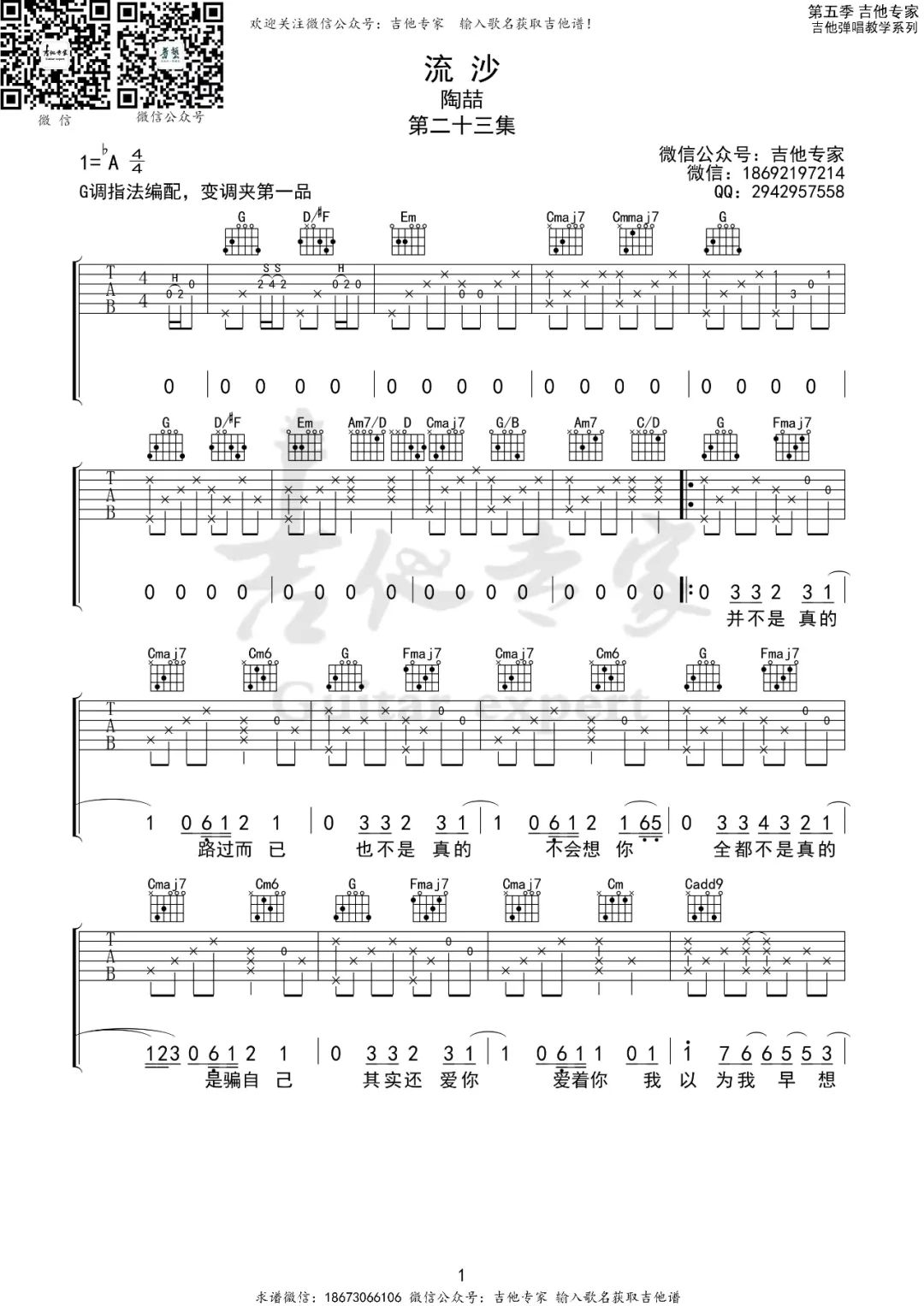 这首歌曲是陶喆演唱的"流沙",采用4/4拍的节奏,原调为降A调,现在使用G调指法编排。演唱时,你可以选择夹1品变调夹以回到原调,根据个人嗓音情况调整。这份曲谱由酷琴谱更新上传,包含3张高清图片,可用于弹唱吉他。"流沙"的旋律深情动人,表达了对爱情的真挚感情,陶