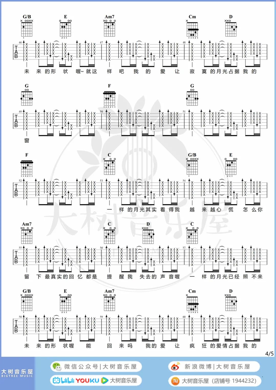 这是徐佳莹演唱的歌曲《一样的月光》的吉他谱。该曲以4/4拍的节奏为基础,原调为降A调,但这份谱采用了G调指法编配。使用变调夹1品即可回到原调,也可根据个人嗓音情况选择。曲谱由酷琴谱上传,包含6张高清图片示范。歌词简单直接,徐佳莹演绎时却清晰鲜明地表达了爱情走向