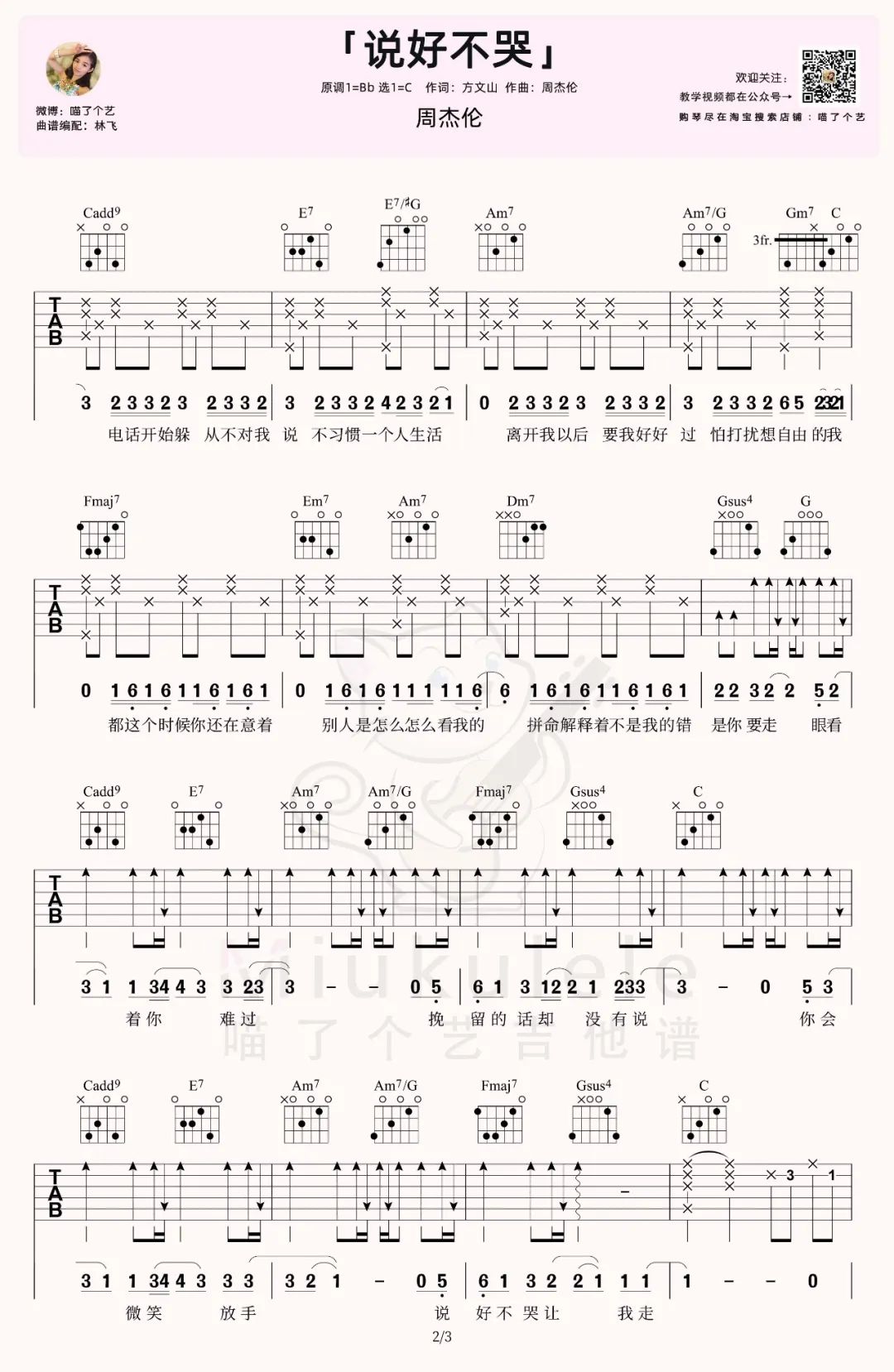 这是一首由周杰伦演唱的情歌,名为《说好不哭》。歌曲采用4/4拍的节奏,原调为降B调,但此谱采用了C调指法编配。谱中包含了吉他弹奏的详细教学,共有3张高清图片示范。歌词中充满了成全与约定的情感,歌词内容描述了面对眼前的难过,却无法挽留的心情:“眼看着你难过,挽留
