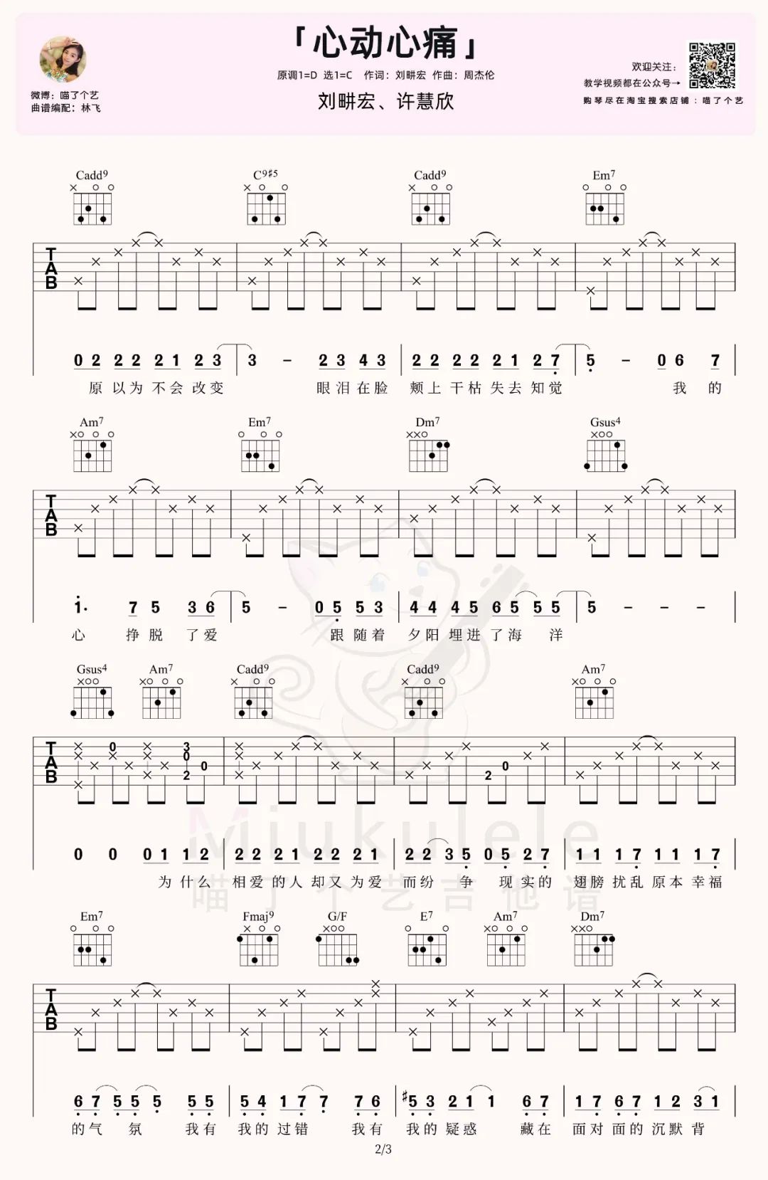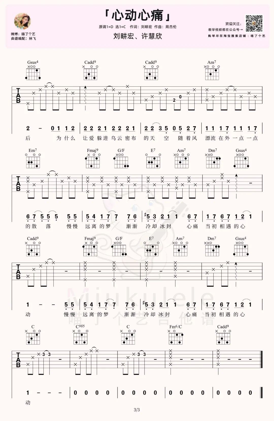 这是一首由刘畊宏演唱的歌曲《心动心痛》的吉他谱。歌曲采用了4/4拍的节奏,原调为D调,但此谱以C调指法编配。演唱时可使用变调夹在2品,也可根据个人嗓音情况选择。曲谱共3张高清图片,由酷琴谱上传,示范演奏来源于@喵了个艺编配。歌曲由周杰伦作曲,歌词则来自刘畊宏。
