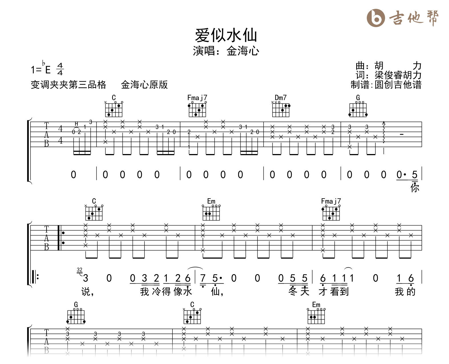 "爱似水仙" 是一首由金海心演唱的经典情歌,吉他谱提供了精心编排的扫弦伴奏技巧,旋律委婉动听,通过抒发情感以物喻人。这首歌以原调bE为基础,采用C调指法原版弹唱,只需使用变调夹夹三品格即可演奏。提供了三张高清图片谱,非常适合吉他爱好者收藏和练习。如果你想尝试演