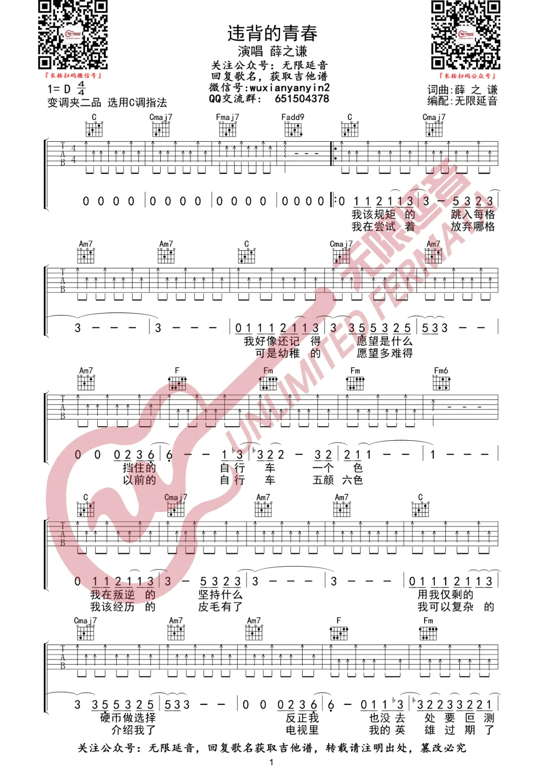 《薛之谦《违背的青春吉他谱》(C调)》内容来自于互联网,不能保证内容的准确性与完整性,仅供学习交流欣赏,请勿用于其它用途,内容版权归原作者及来源网站所有,如有侵犯到您的权益请来信告知,我们将及时删除。