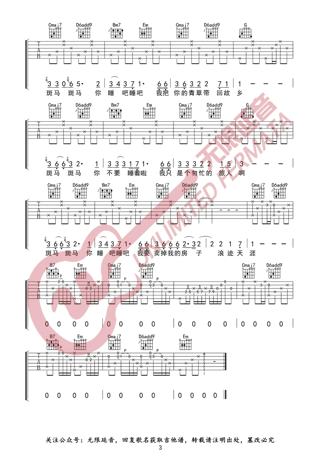《宋冬野《斑马斑马吉他谱》(G调)》内容来自于互联网,不能保证内容的准确性与完整性,仅供学习交流欣赏,请勿用于其它用途,内容版权归原作者及来源网站所有,如有侵犯到您的权益请来信告知,我们将及时删除。