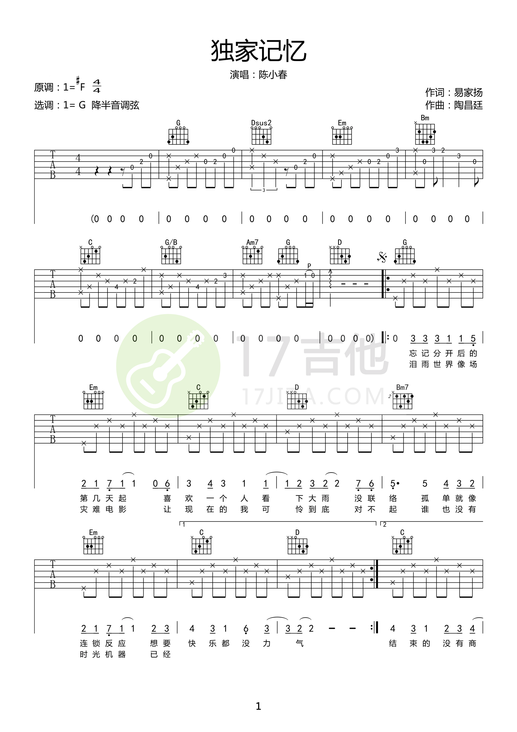 《陈小春《独家记忆吉他谱》(G调)》内容来自于互联网,不能保证内容的准确性与完整性,仅供学习交流欣赏,请勿用于其它用途,内容版权归原作者及来源网站所有,如有侵犯到您的权益请来信告知,我们将及时删除。