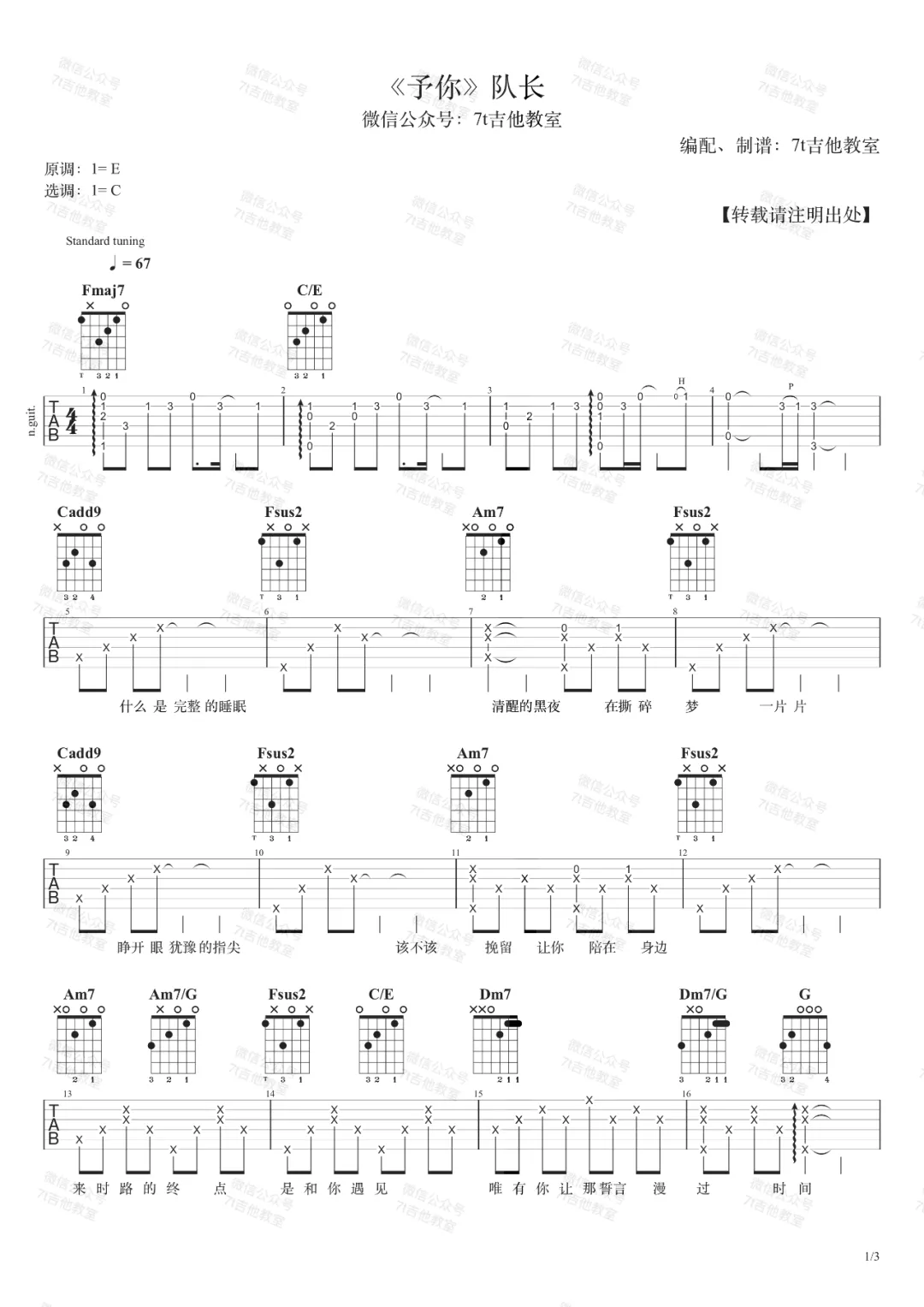 《队长《予你吉他谱》(C调)》内容来自于互联网,不能保证内容的准确性与完整性,仅供学习交流欣赏,请勿用于其它用途,内容版权归原作者及来源网站所有,如有侵犯到您的权益请来信告知,我们将及时删除。