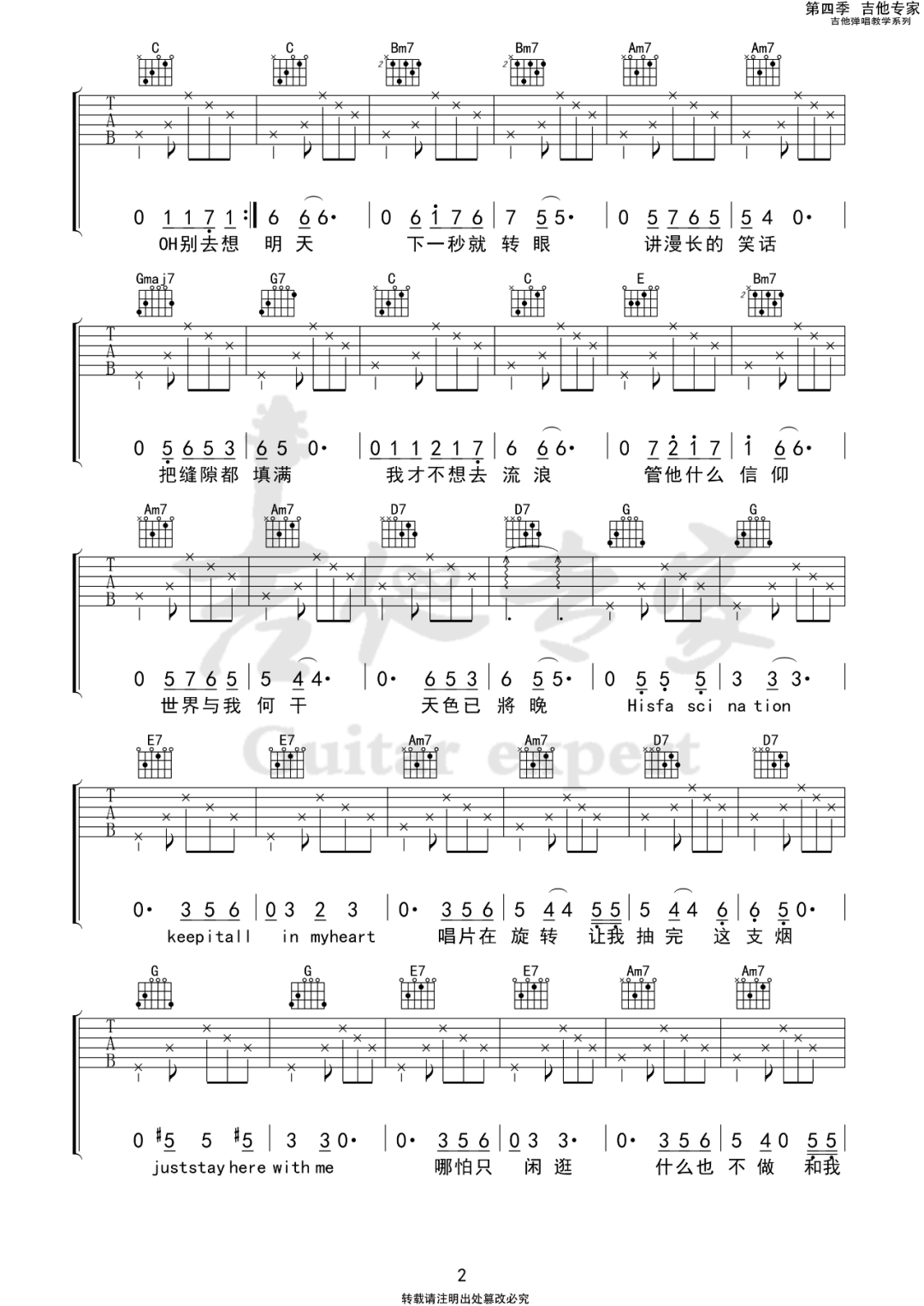 这是一首由许嵩演唱的吉他曲谱,源自《天龙八部之宿敌》。歌曲采用4/4拍的节奏,原调为#F,但此曲谱以C调编排。你可使用变调夹至6品以复原原调,或依据个人音域进行调整。这份谱由酷琴谱提供,包含3张高清图片示范弹奏。歌词充满情感与故事性,深刻探讨了命运与爱情之间的