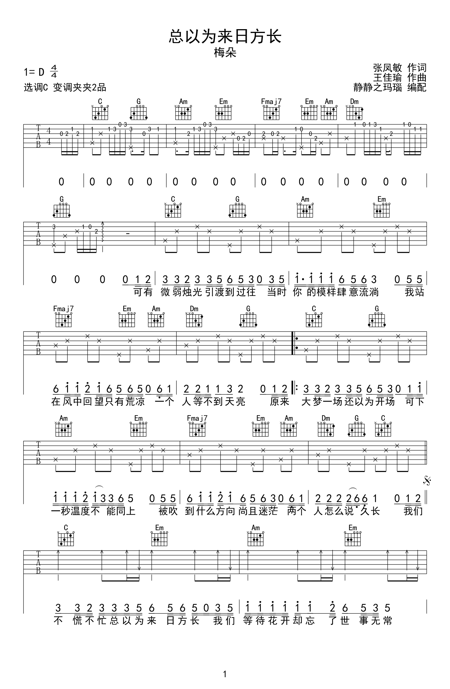 《梅朵《总以为来日方长吉他谱》(C调)》内容来自于互联网,不能保证内容的准确性与完整性,仅供学习交流欣赏,请勿用于其它用途,内容版权归原作者及来源网站所有,如有侵犯到您的权益请来信告知,我们将及时删除。