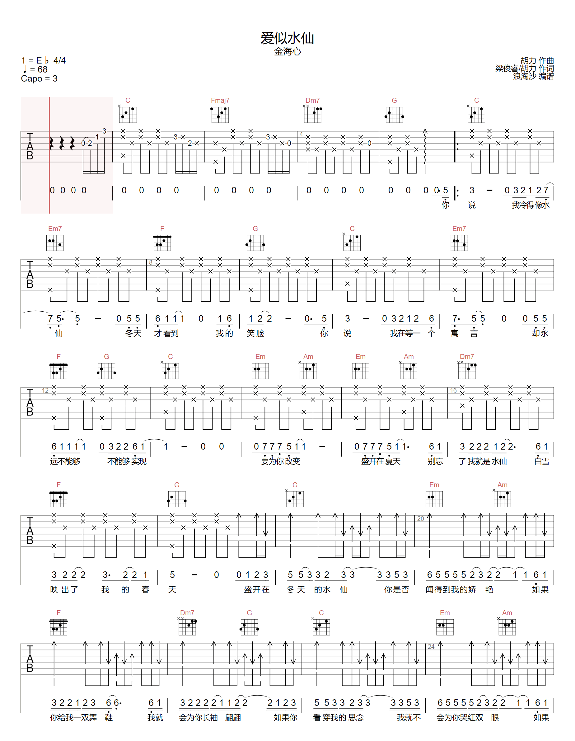 《金海心《爱似水仙吉他谱》(C调)》内容来自于互联网,不能保证内容的准确性与完整性,仅供学习交流欣赏,请勿用于其它用途,内容版权归原作者及来源网站所有,如有侵犯到您的权益请来信告知,我们将及时删除。
