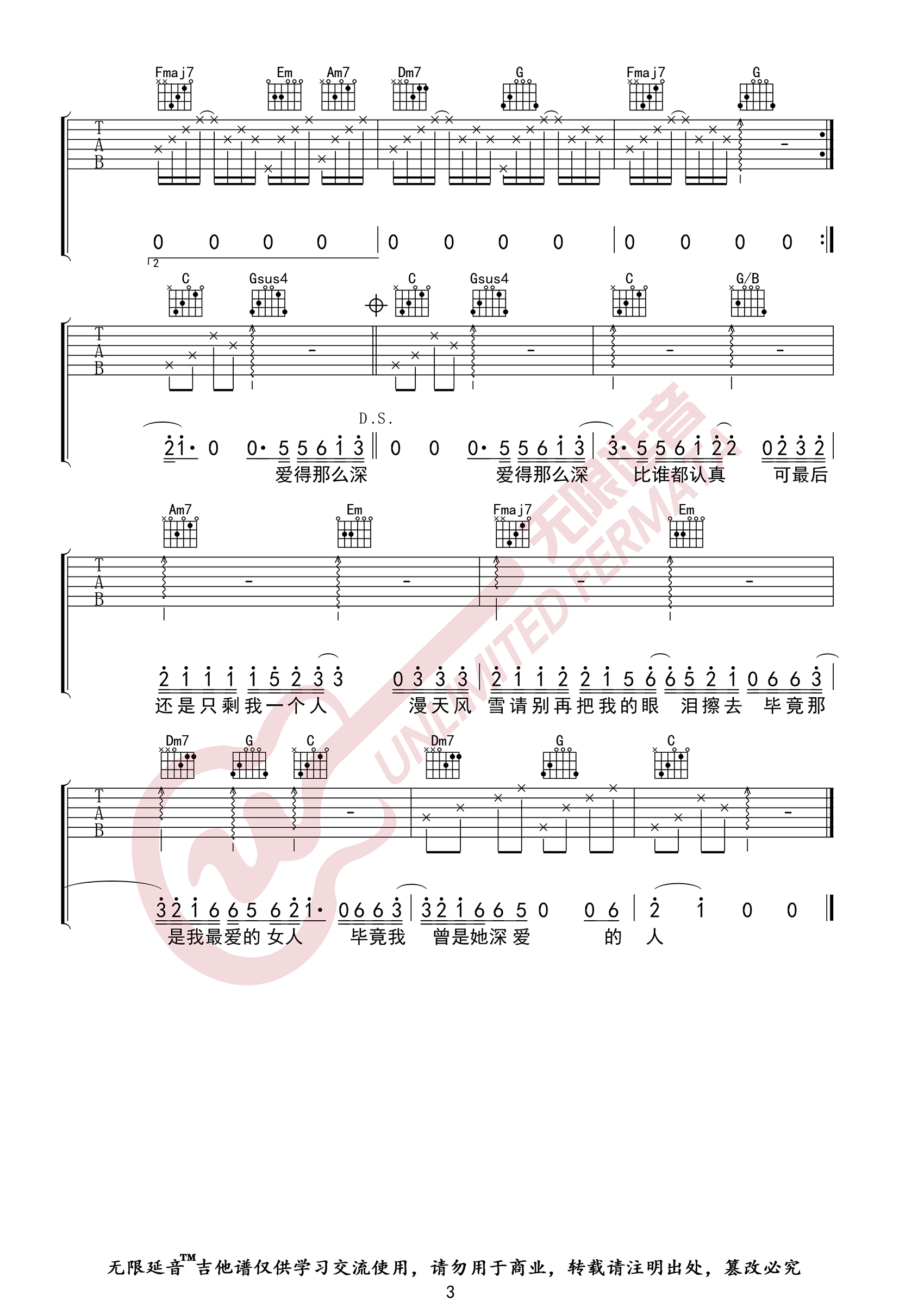 《薛之谦《认真的雪吉他谱》(C调)》内容来自于互联网,不能保证内容的准确性与完整性,仅供学习交流欣赏,请勿用于其它用途,内容版权归原作者及来源网站所有,如有侵犯到您的权益请来信告知,我们将及时删除。