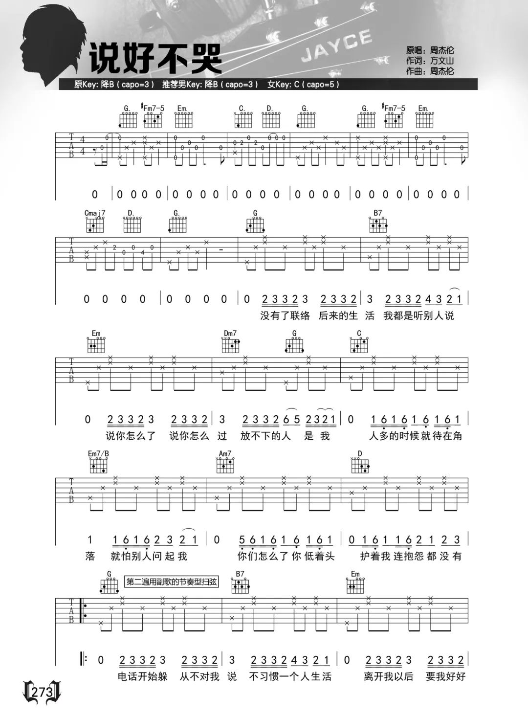 这是一首深情款款的歌曲——周杰伦演唱的《说好不哭》。歌曲采用4/4的拍子,原调为降B调,但这份吉他谱选用了G调指法编配。演唱时,你可以使用变调夹在第3品,回到原调,也可以根据个人嗓音情况进行调整。这份曲谱由酷琴谱上传,共2张高清图片,提供了详细的指法和弹唱示例