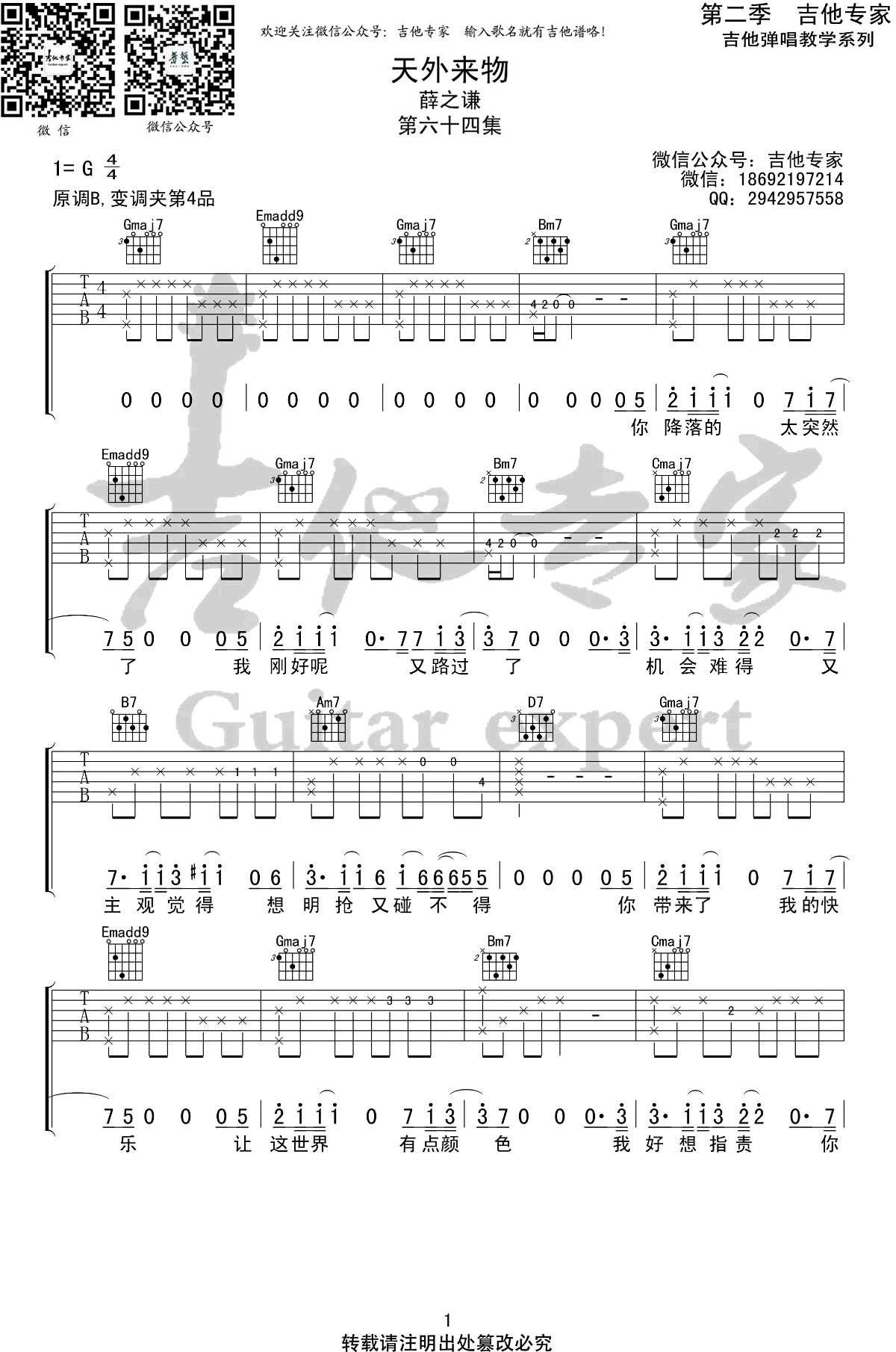 《薛之谦《天外来物吉他谱》(G调)》内容来自于互联网,不能保证内容的准确性与完整性,仅供学习交流欣赏,请勿用于其它用途,内容版权归原作者及来源网站所有,如有侵犯到您的权益请来信告知,我们将及时删除。