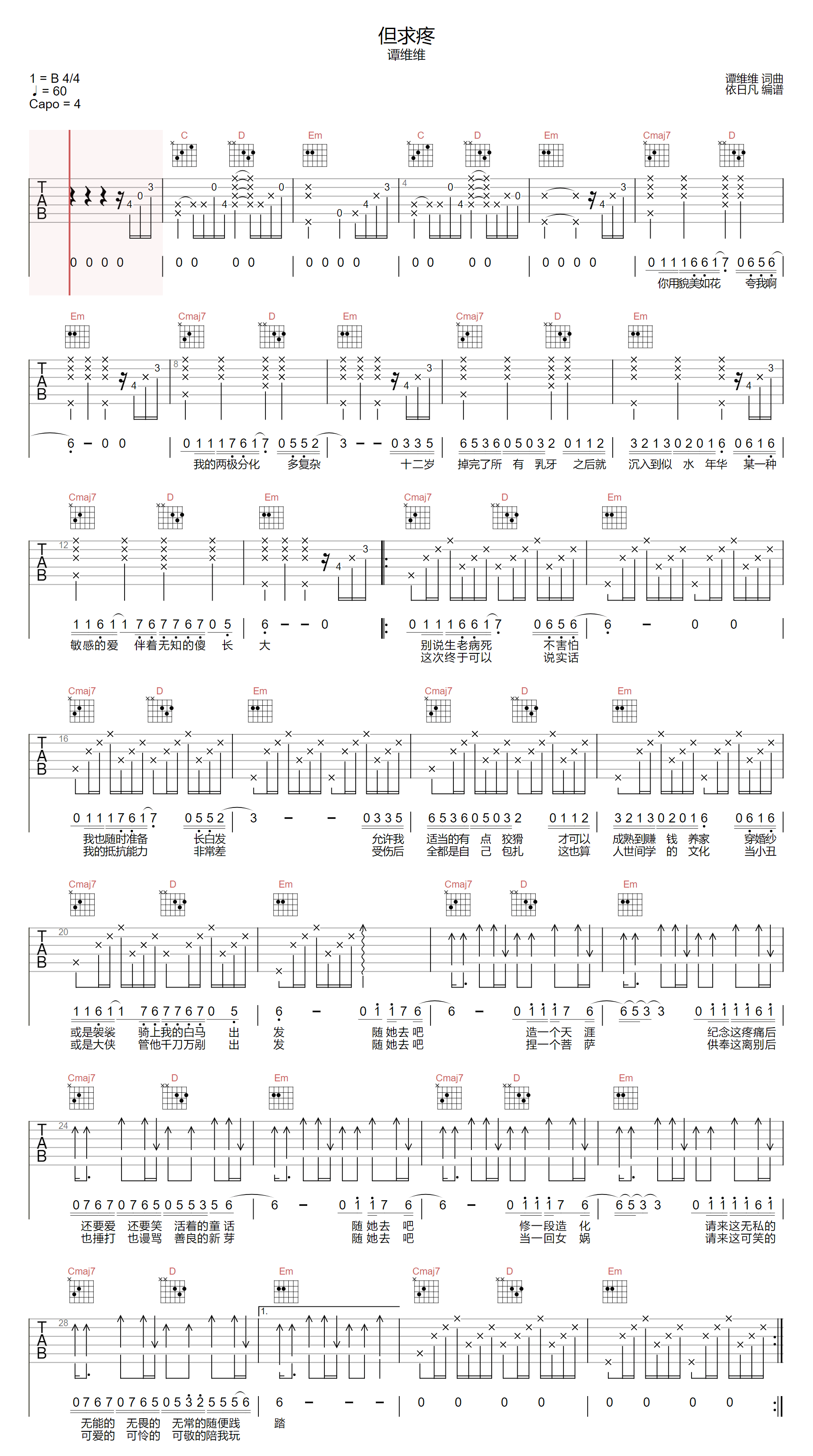 这是一首由谭维维演唱的歌曲《但求疼》的吉他谱,采用了G调指法编配。歌曲以四川话表达,意味着某人毫无价值,或者漠不关心。谭维维深沉的嗓音和富有诗意的歌词相结合,构成了一幅充满生命力的画面。歌曲节奏为4/4拍,原调为B调,但这份曲谱使用了G调指法,演唱时可以使用变