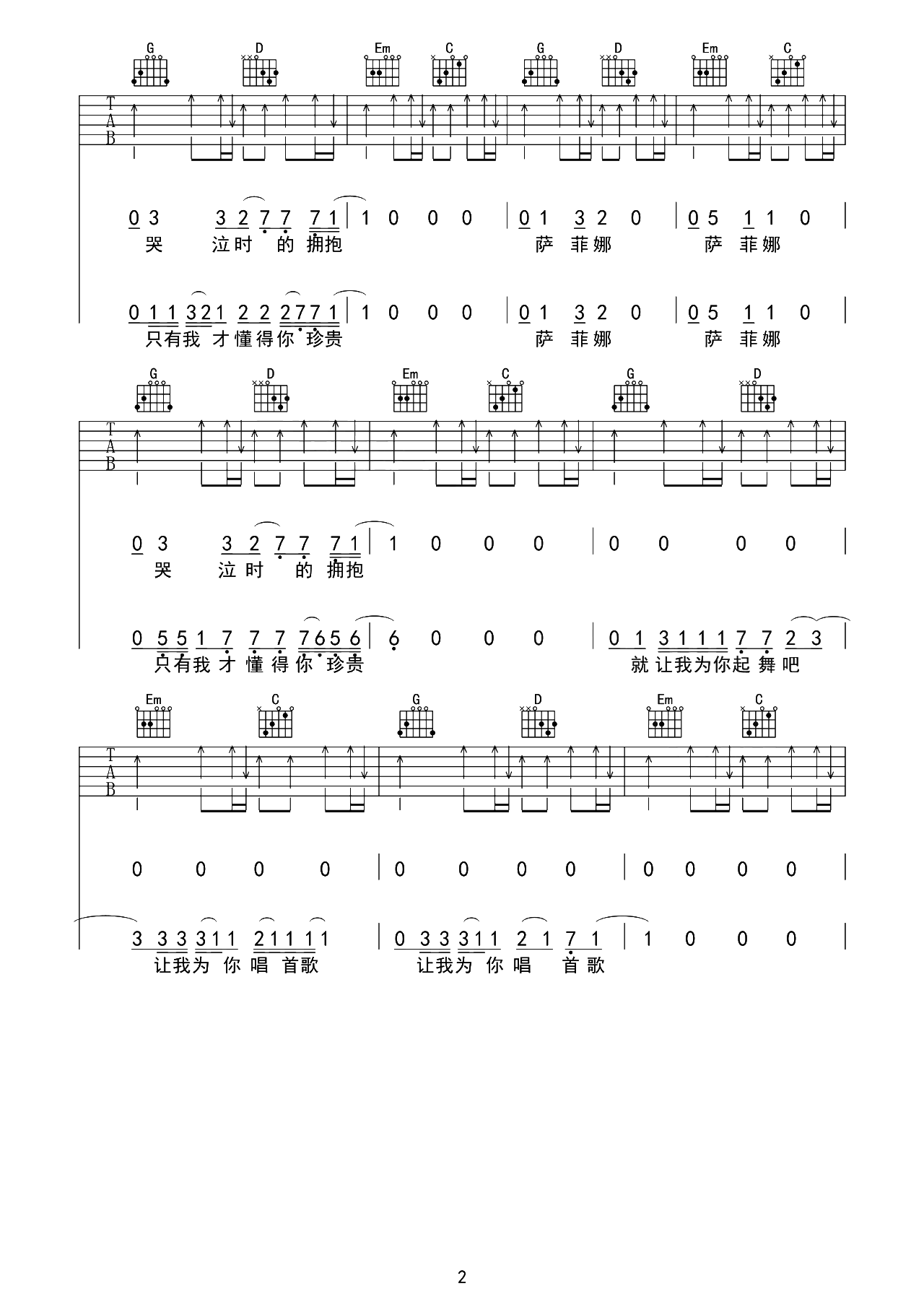 这首《为你唱首歌》是痛仰乐队主唱高虎专为一位名叫萨菲娜的女孩儿创作的歌曲,表达了深刻的爱意。该曲的吉他谱包括两张高清PNG图例,采用G调指法,使用CAPO夹在第2品位,演奏难度低,适合初学者。这首歌以扫弦的方式演奏,旋律简单易学,能够完美诠释内心对某人深切情感