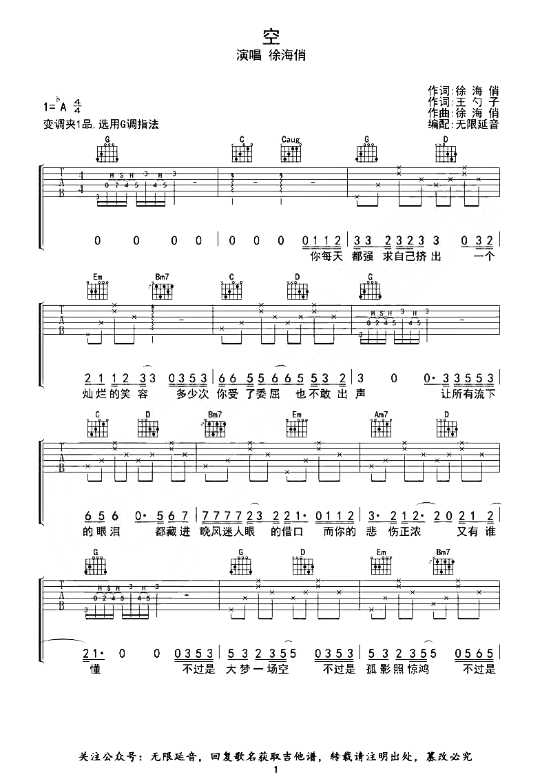 《徐海俏《空吉他谱》(G调)》内容来自于互联网,不能保证内容的准确性与完整性,仅供学习交流欣赏,请勿用于其它用途,内容版权归原作者及来源网站所有,如有侵犯到您的权益请来信告知,我们将及时删除。