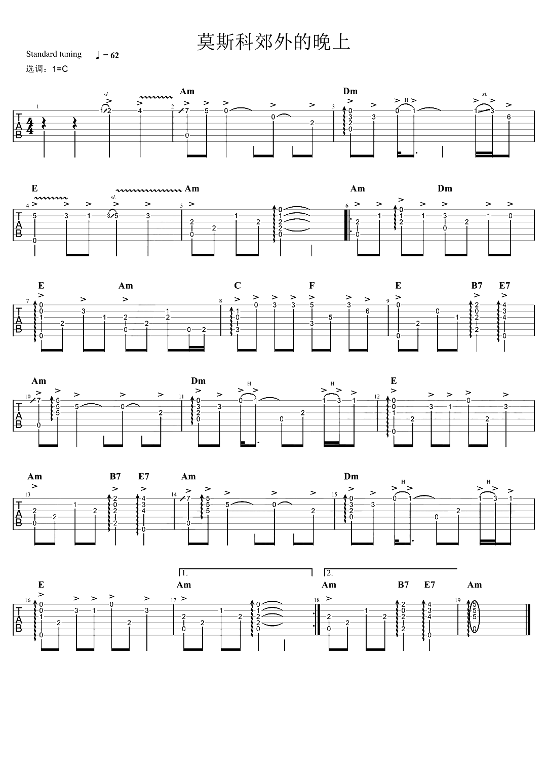 这首曲谱是一张高清的指弹谱,以C调为基础,演奏速度为每分钟62拍,采用4/4拍的韵律,难度适中,适合3级的指弹者。它是基于俄罗斯歌曲改编而成,描述了莫斯科郊外的夜晚场景。此曲的音乐温柔舒缓,歌词简洁,充分表达了对俄罗斯的深厚热爱。演奏这首曲目,能够将内心深处的