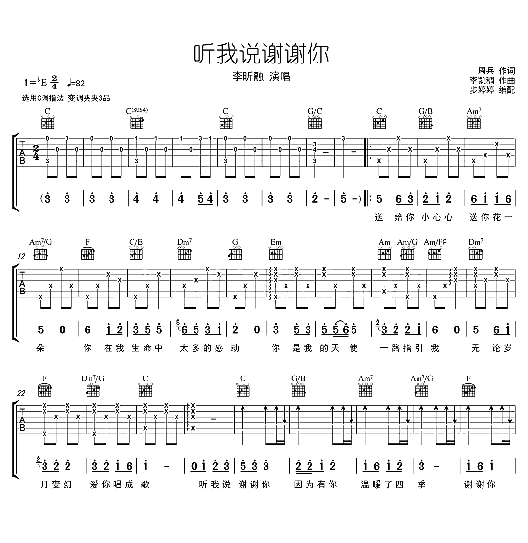 《李昕融《听我说谢谢你吉他谱》(C调)》内容来自于互联网,不能保证内容的准确性与完整性,仅供学习交流欣赏,请勿用于其它用途,内容版权归原作者及来源网站所有,如有侵犯到您的权益请来信告知,我们将及时删除。