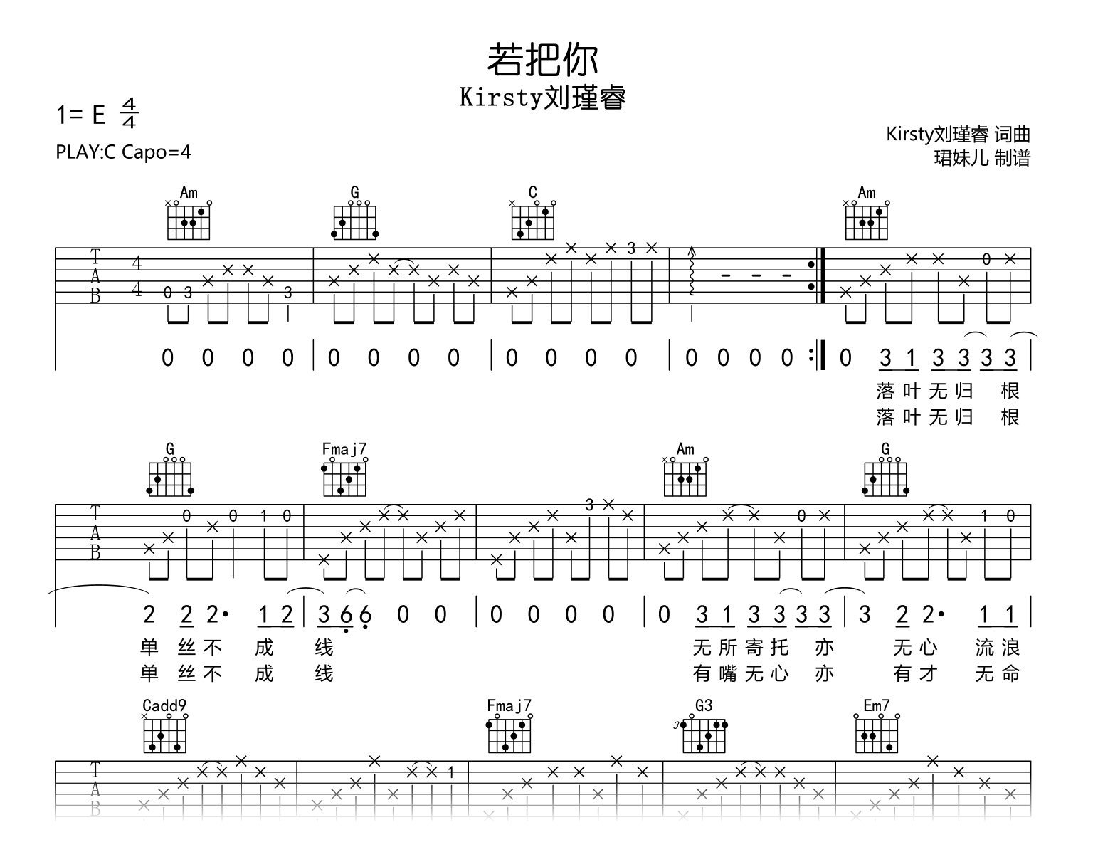 Kirsty刘瑾睿在《我的音乐你听吗》演唱了一首歌曲《若把你》,原调E,吉他弹唱谱采用C调指法编配,建议使用变调夹在4品,速度为85BPM。这首曲谱难度较简单,适合初学者入手,带着Kirsty的表演,这首歌将在你的吉他演奏中展现出魅力。