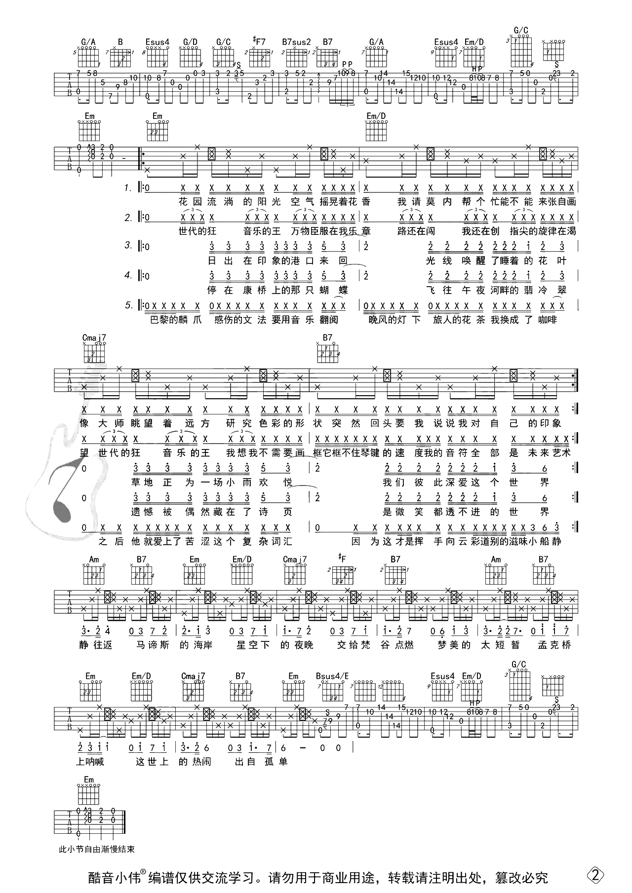 《周杰伦《最伟大的作品吉他谱》(G调)》内容来自于互联网,不能保证内容的准确性与完整性,仅供学习交流欣赏,请勿用于其它用途,内容版权归原作者及来源网站所有,如有侵犯到您的权益请来信告知,我们将及时删除。
