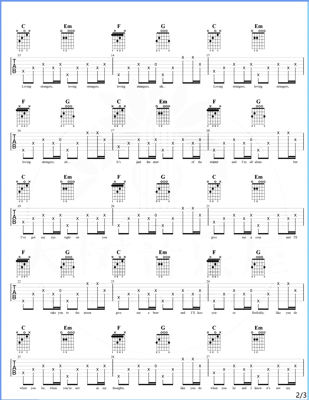 《Russian Red《Loving Strangers吉他谱》(C调)》内容来自于互联网,不能保证内容的准确性与完整性,仅供学习交流欣赏,请勿用于其它用途,内容版权归原作者及来源网站所有,如有侵犯到您的权益请来信告知,我们将及时删除。