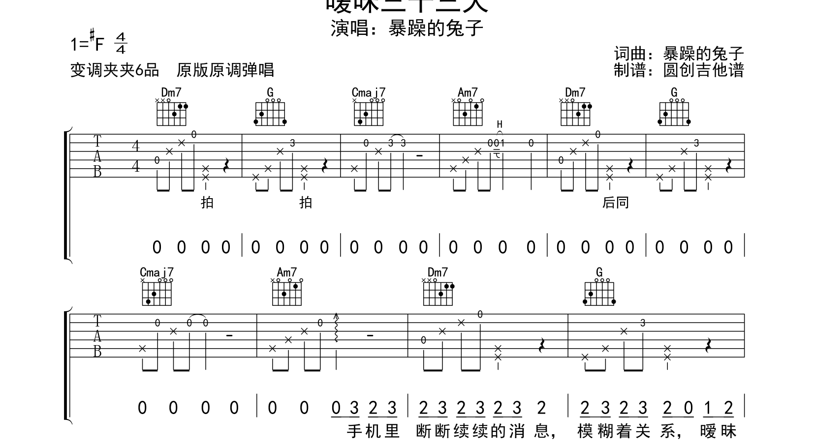 《暴躁的兔子《暧昧三十三天吉他谱》(C调)》内容来自于互联网,不能保证内容的准确性与完整性,仅供学习交流欣赏,请勿用于其它用途,内容版权归原作者及来源网站所有,如有侵犯到您的权益请来信告知,我们将及时删除。