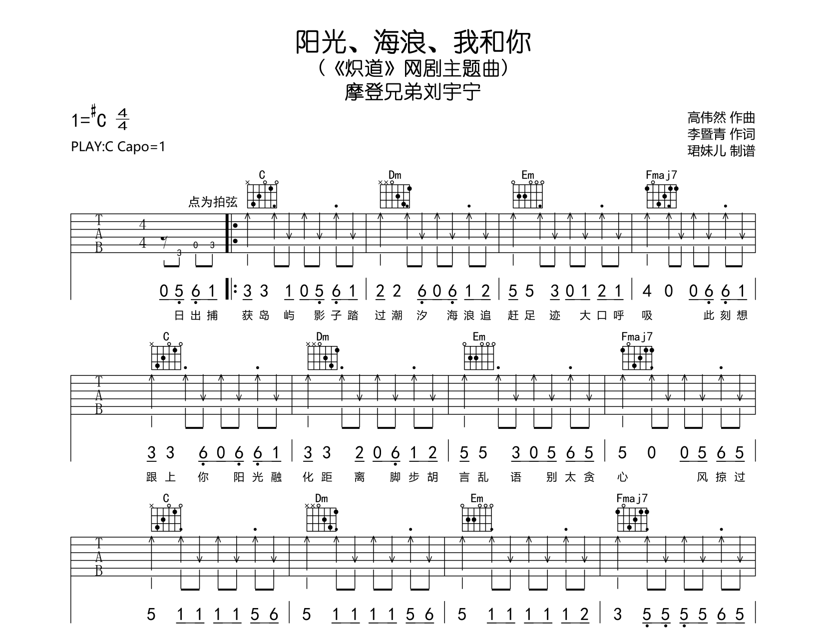 《炽道》网剧主题曲《阳光、海浪、我和你》是一首简单易学的吉他曲,由珺妹儿制谱,采用C调指法编配。演唱者刘宇宁为其赋予了独特的魅力。建议使用变调夹1品,速度保持在75BPM,让演奏更为流畅。谱中共包含4张高清六线谱图例,让学习者能够清晰地理解每个音符的位置。这首